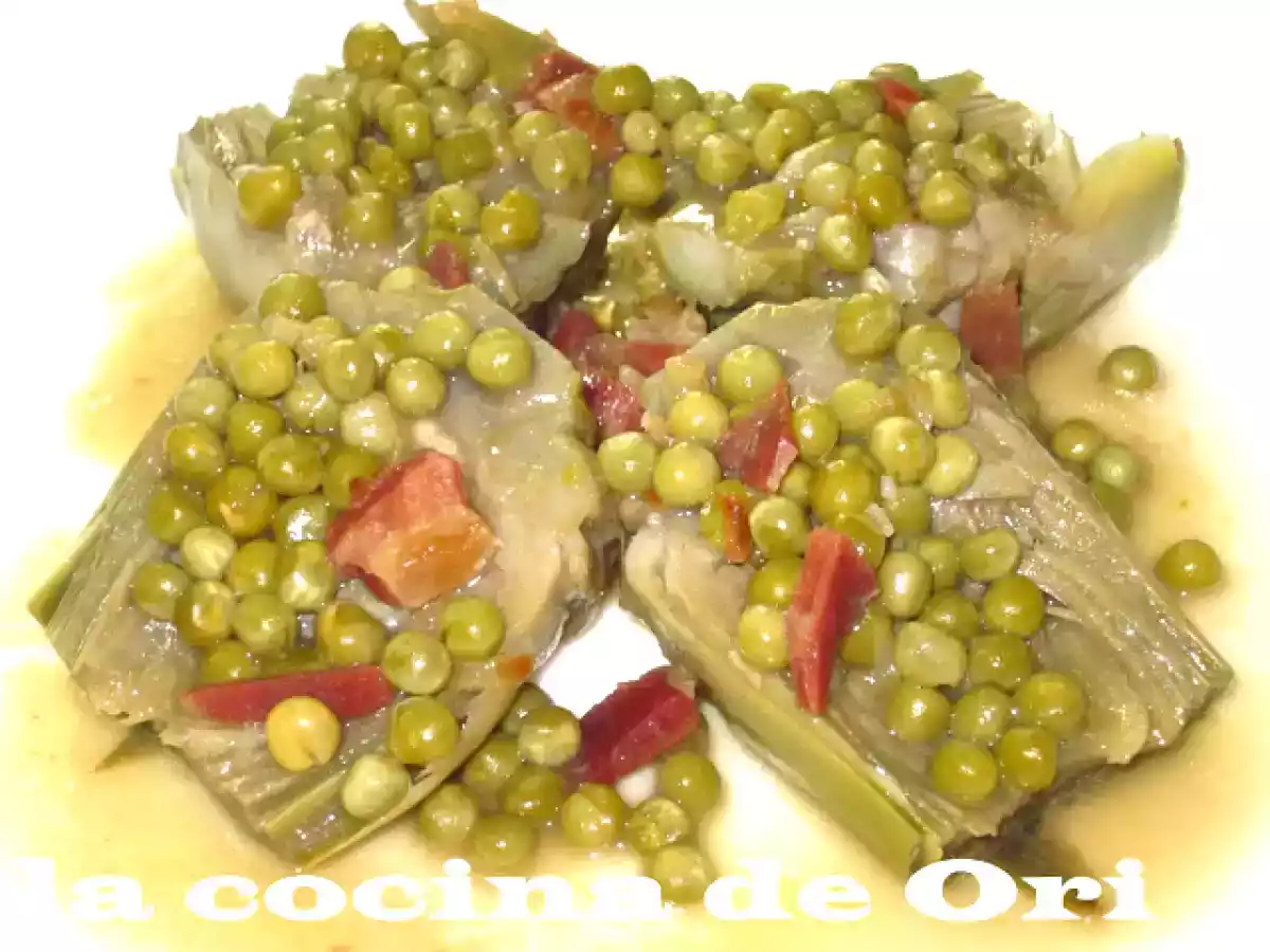 Alcachofas con guisantes y jamón PlatoFácil50 min Enviar esta receta a un amigo Imprimir esta página Preguntar al autor Publicar la foto de esta receta Ingredientes 4 8 alcachofas grandes preferentemente de Tudela 200 gr de jamón en taquitos 1 lata pequeña de guisantes aceite de oliva virgen extra 1 cucharadita de café de harina 1 cebolla mediana 2 dientes de ajo en trocitos el zumo de 1/2 limón