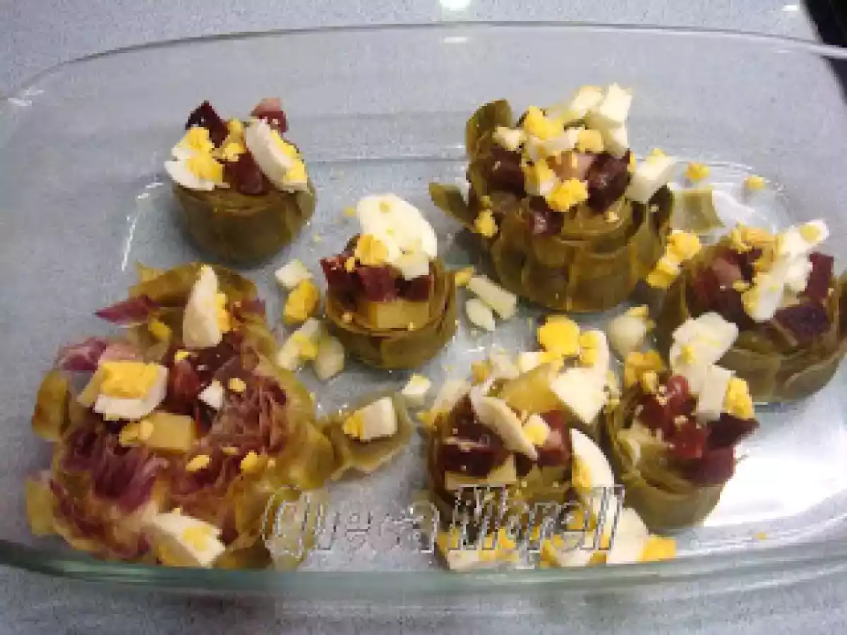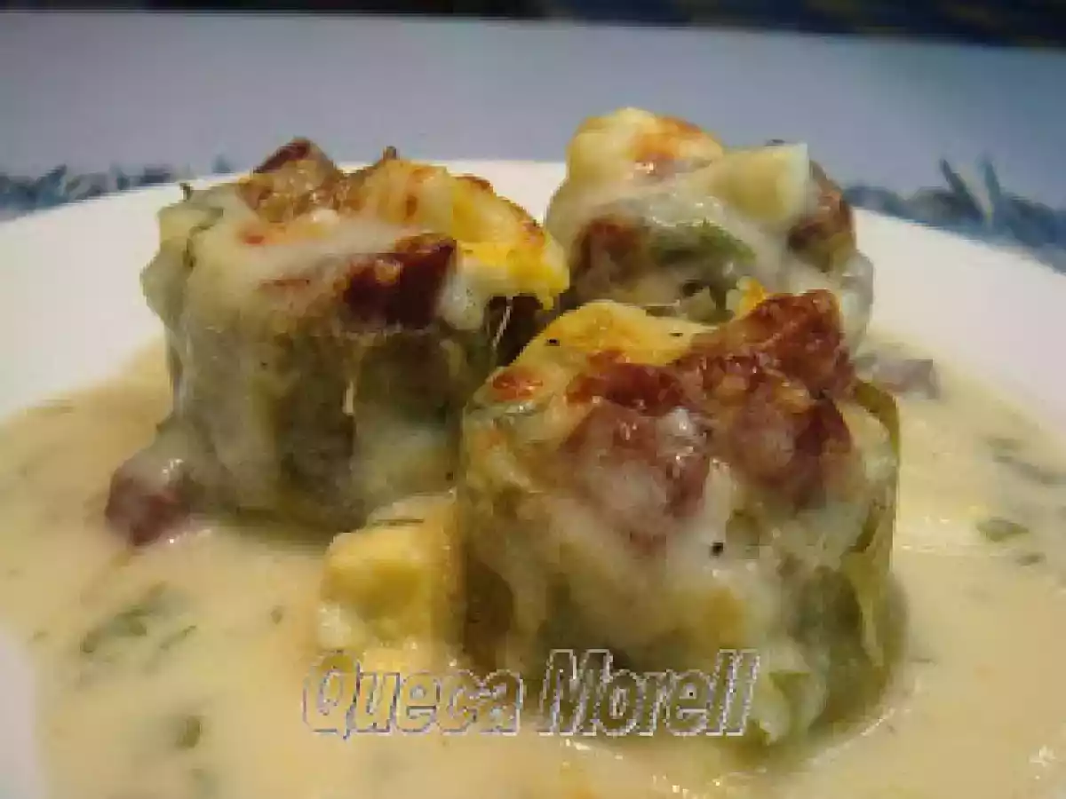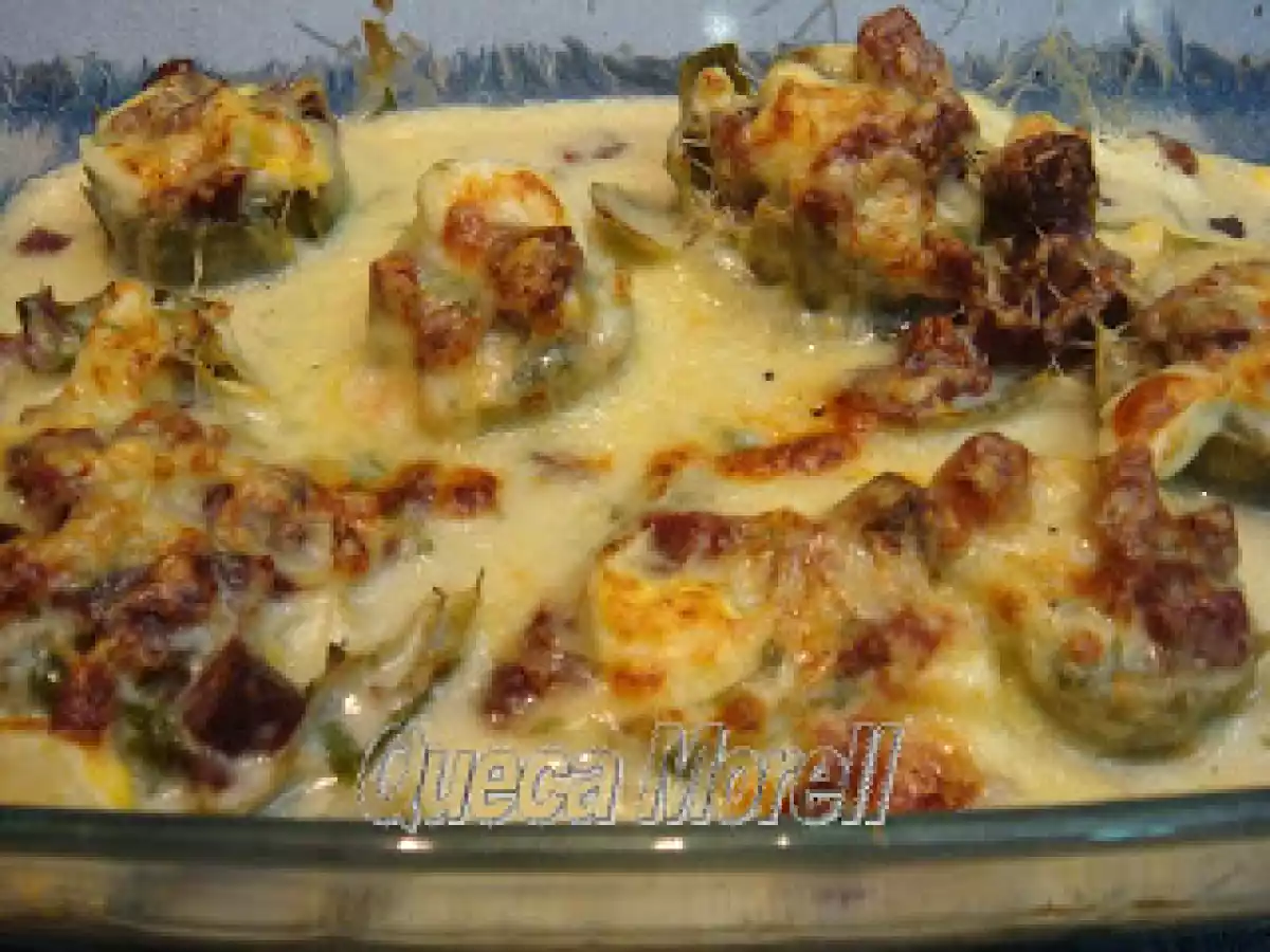 Alcachofas rellenas gratinadas. vota ahora AnteriorSiguiente PlatoFácil40 min Enviar esta receta a un amigo Imprimir esta página Preguntar al autor Publicar la foto de esta receta Disfruta de esta deliciosa receta. Ingredientes 4 para cocer las alcachofas: alcachofas agua 1 vaso de vino blanco 1/2 limón un manojito de perejil sal para la bechamel: 1 cucharada de mantequilla 1 cucharada de harina leche caldo de cocer las alcachofas perejil picado sal y pimienta nuez moscada para el relleno: taquitos de jamón serrano queso gruyere en tacos huevo cocido picado más queso gruyere, pero este rallado para gratinar