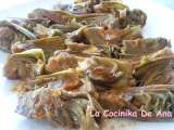 - Una vez que los vemos picados, poner la mariposa en las cuchillas y añadir las alcachofas cortadas en 6 trocitos, el aceite, el agua, la sal y una cucharada de pimentón.