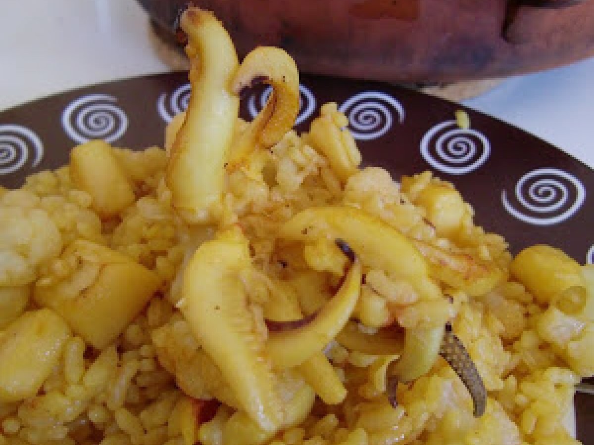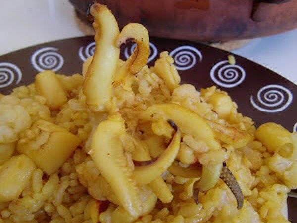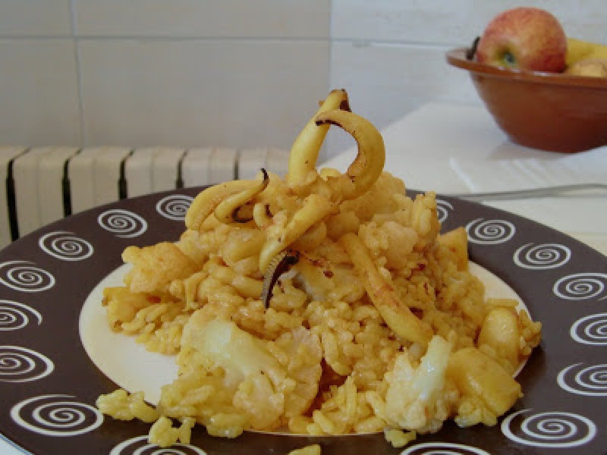 Arroz al horno con sepia y coliflor AnteriorSiguiente PlatoFácil33 min Enviar esta receta a un amigo Imprimir esta página Preguntar al autor Publicar la foto de esta receta Ingredientes 2 5 puñados de arroz. "2 por persona y otro para el que venga" 1 sepia de unos 400 g cortada en dados, reservé los tentáculos enteros. 1/2 coliflor pequeña separada en ramitos 2 tomates pequeños y maduros, pelados y picados 1 diente de ajo picado Unas cucharadas de aceite de oliva virgen 350 ml de caldo de pescado, el doble del arroz pesado Azafrán en polvo Sal
