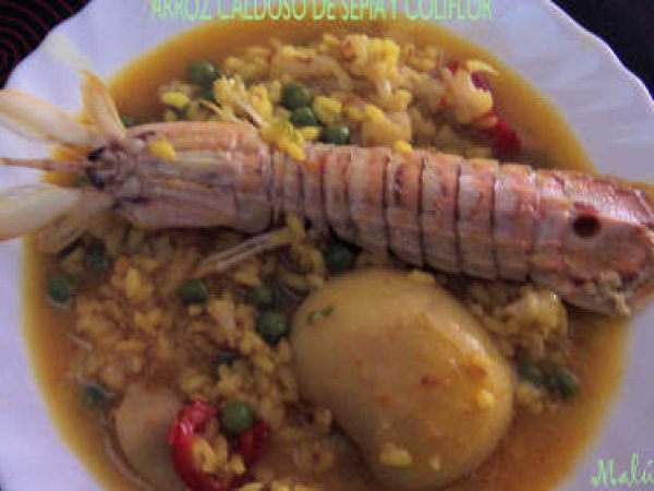 Arroz caldoso de sepia y coliflor PlatoMedio1 hora Enviar esta receta a un amigo Imprimir esta página Preguntar al autor Publicar la foto de esta receta Ingredientes 1 4 sepias medianas 100 grs. de calamares pequeñitos 4 galeras 250 grs. de coliflor 100 grs. de setas de cardo 40 grs. de pimiento rojo 2 dientes de ajo 2 tomates de la pera rallados 100 grs. de guisantes congelados Caldo de pescado 3/4 de vaso de arroz ( de grano redondo ) Aceite de oliva Sal Colorante alimenticio