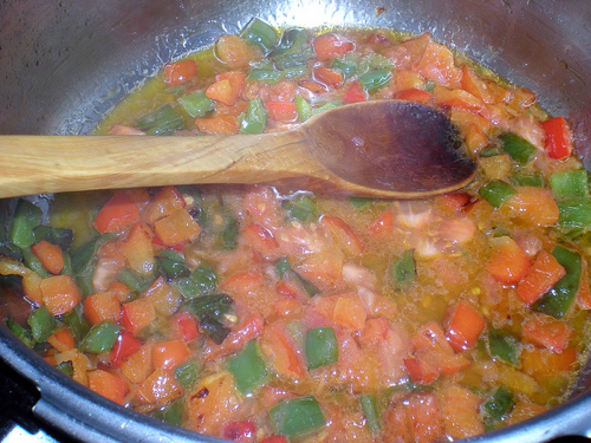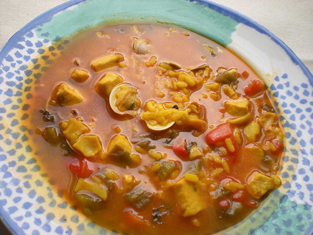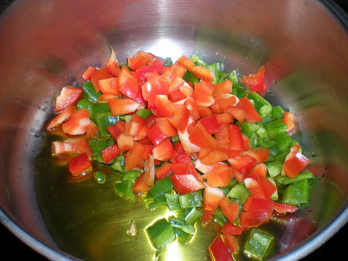 Arroz caldoso en olla rápida. paso a paso AnteriorSiguiente PlatoFácil30 min585 Kcal Enviar esta receta a un amigo Imprimir esta página Preguntar al autor Publicar la foto de esta receta Ingredientes 2 1 pimiento verde 1 pimiento rojo 1 tomate Aceite de oliva virgen extra Calamar (yo usé 4 ya que eran muy pequeños) Pez espada (1 filete) 2 puñados de almejas 3 dientes de ajo Unos granos de pimienta negra Unas hebras de azafrán Sal Curcuma o colorante alimentario 2 cucharadas de tomate frito 1 chorreón de vino blanco 1 vaso de arroz 4 vasos de caldo de pescado