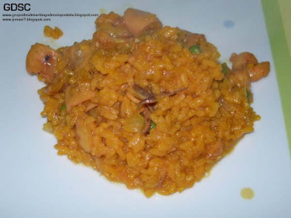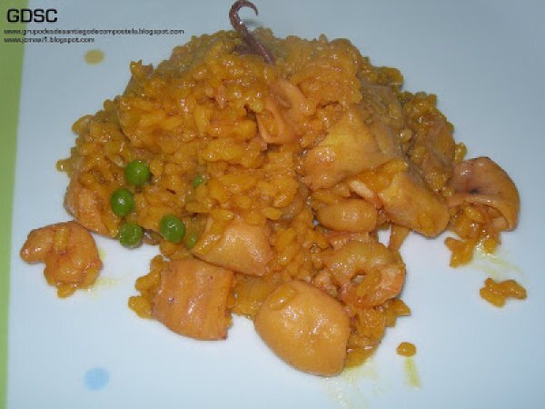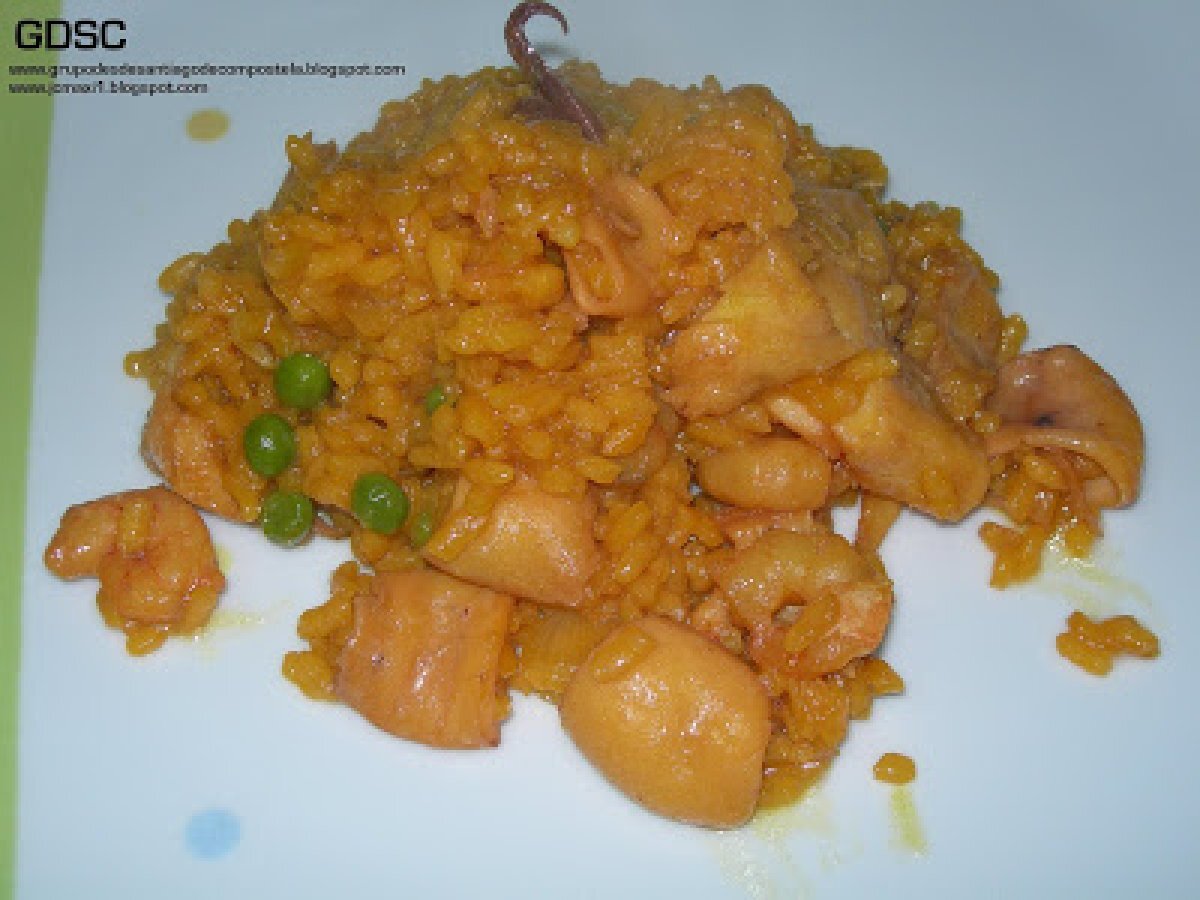 Arroz con bacalao, gambas y chipirones AnteriorSiguiente PlatoMedio50 min Enviar esta receta a un amigo Imprimir esta página Preguntar al autor Publicar la foto de esta receta Ingredientes 4 1 vaso de arroz 150 g de colas de gambas peladas 150 g de chipirones cortados y limpios 150 g de bacalao desmigado 100 g de guisantes 1/2 cebolla aceite vino blanco 1 pastilla de caldo de pescado 1 sobre de azafrán