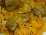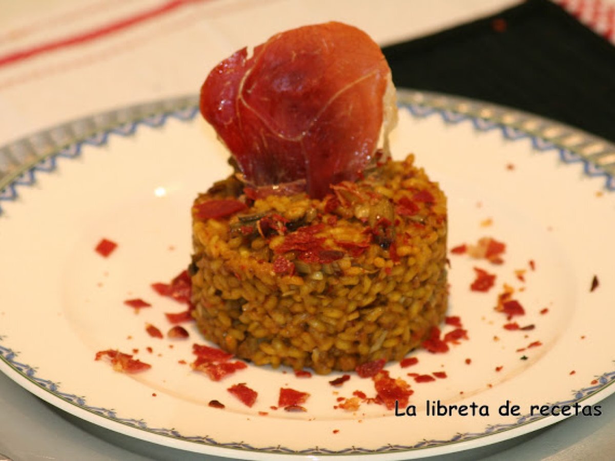 Arroz con foie y alcachofas con peineta de jamón PlatoFácil30 min Enviar esta receta a un amigo Imprimir esta página Preguntar al autor Publicar la foto de esta receta Ingredientes 2 200 g de arroz D.O. Valencia 125 g foie. 600 ml. de caldo de pollo 2 alcachofas 2 cortadas de jamón de Trevelez Una cebolla tierna 1 diente de ajo 1 tomate de pera 1 chorrito pequeño de PX