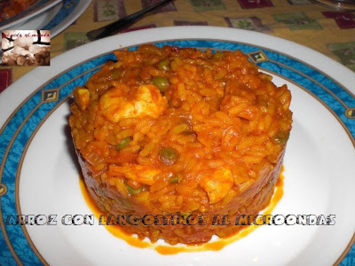 Arroz con langostinos al microondas AnteriorSiguiente PlatoFácil50 min338 Kcal Enviar esta receta a un amigo Imprimir esta página Preguntar al autor Publicar la foto de esta receta Ingredientes 2 un vaso de agua de arroz 100 grs. de langostinos pelados 100 ml de tomate frito un puñado de guisantes congelados dos vasos de agua de caldo de cocer los langostinos una cebolla ajo aceite sal curry Costo estimado: 8.37Euros€ (4.18€/porción)