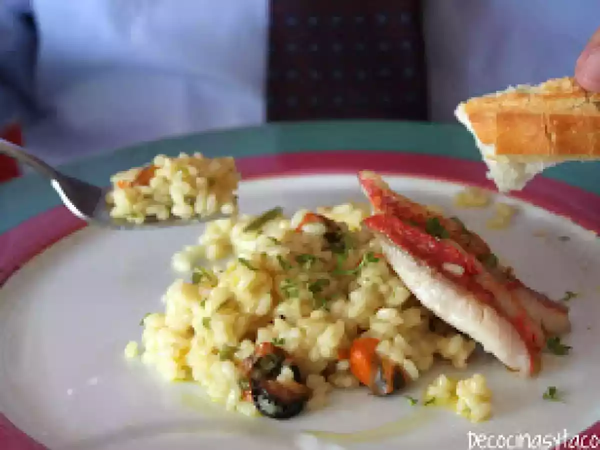 Arroz cremoso marinero vota ahora AnteriorSiguiente PlatoFácil45 min855 Kcal Enviar esta receta a un amigo Imprimir esta página Preguntar al autor Publicar la foto de esta receta Ingredientes 2 140 g de arroz bomba 1 cebolleta 1 ajo picado 1 pimiento verde 200 g de mejillones limpios 3/4 de l de caldo de pescado 6 cucharadas de aceite de oliva perejil picado Azafrán Sal y pimienta Pedir al pescatero que limpie los salmonetes y deje los lomos sin espinas Aceite de oliva Sal maldon