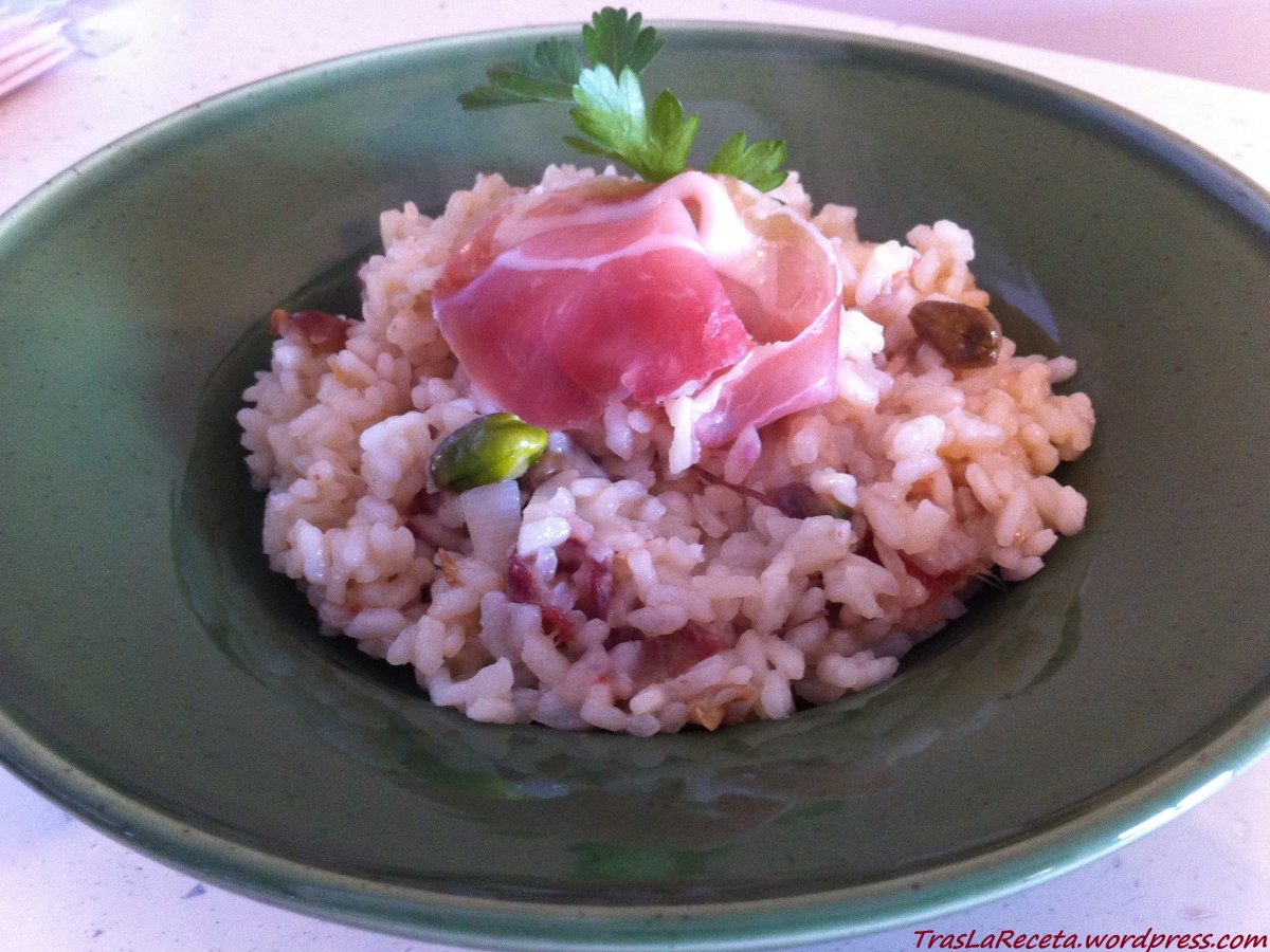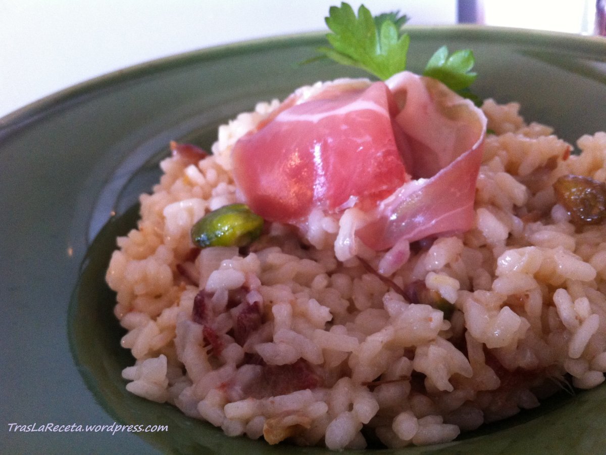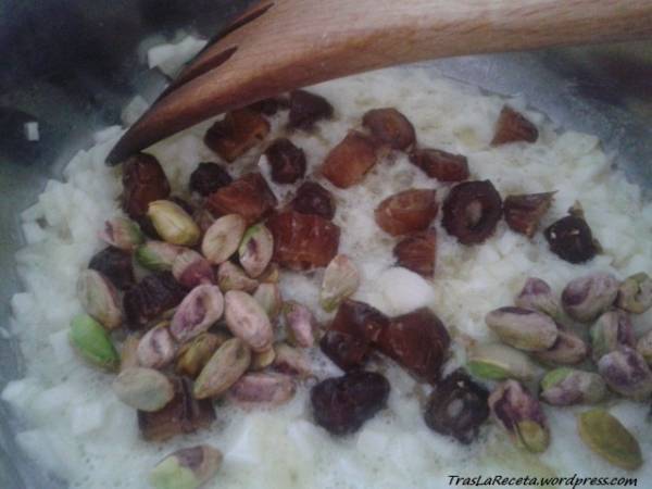 Para los que gustan del arroz como a mi, les traigo una propuesta 100% de mi inspiración. Es una receta a medio camino del risotto porque empleé un poco de mantequilla, pero pasé por alto el toque del queso. Seguro que si lo prueban no lo echarán en falta. Con sólo un puñado de pistachos tostados y unos dátiles sin huesos conseguirás un plato 10 en sabor y textura.