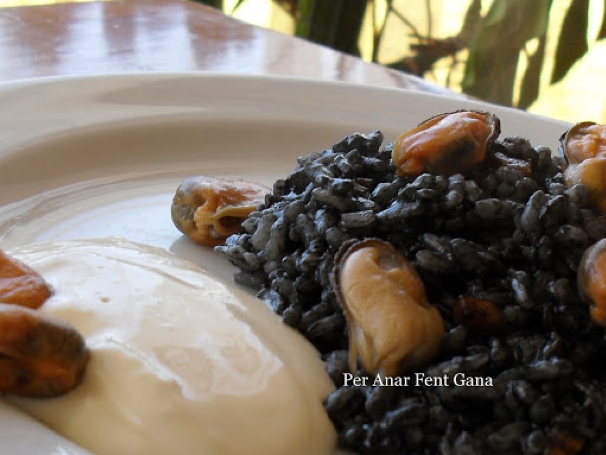 Arroz negro de mejillones vota ahora AnteriorSiguiente PlatoFácil20 min Enviar esta receta a un amigo Imprimir esta página Preguntar al autor Publicar la foto de esta receta Ingredientes 2 Mejillones: 500 g (abiertos al vapor ) 2 cebollas Ajo: 2 Dientes Sal Pimiento verde: 1 Aceite de oliva Tinta de calamar: 1 Sobre 200 g de arroz bomba 100 g de cebolla Vino blanco: 1vaso pequeño Fumet de pescado 1/2 L(proximadamente) All i Oli