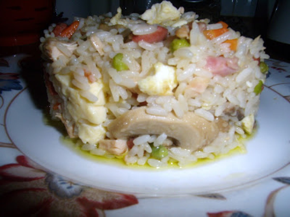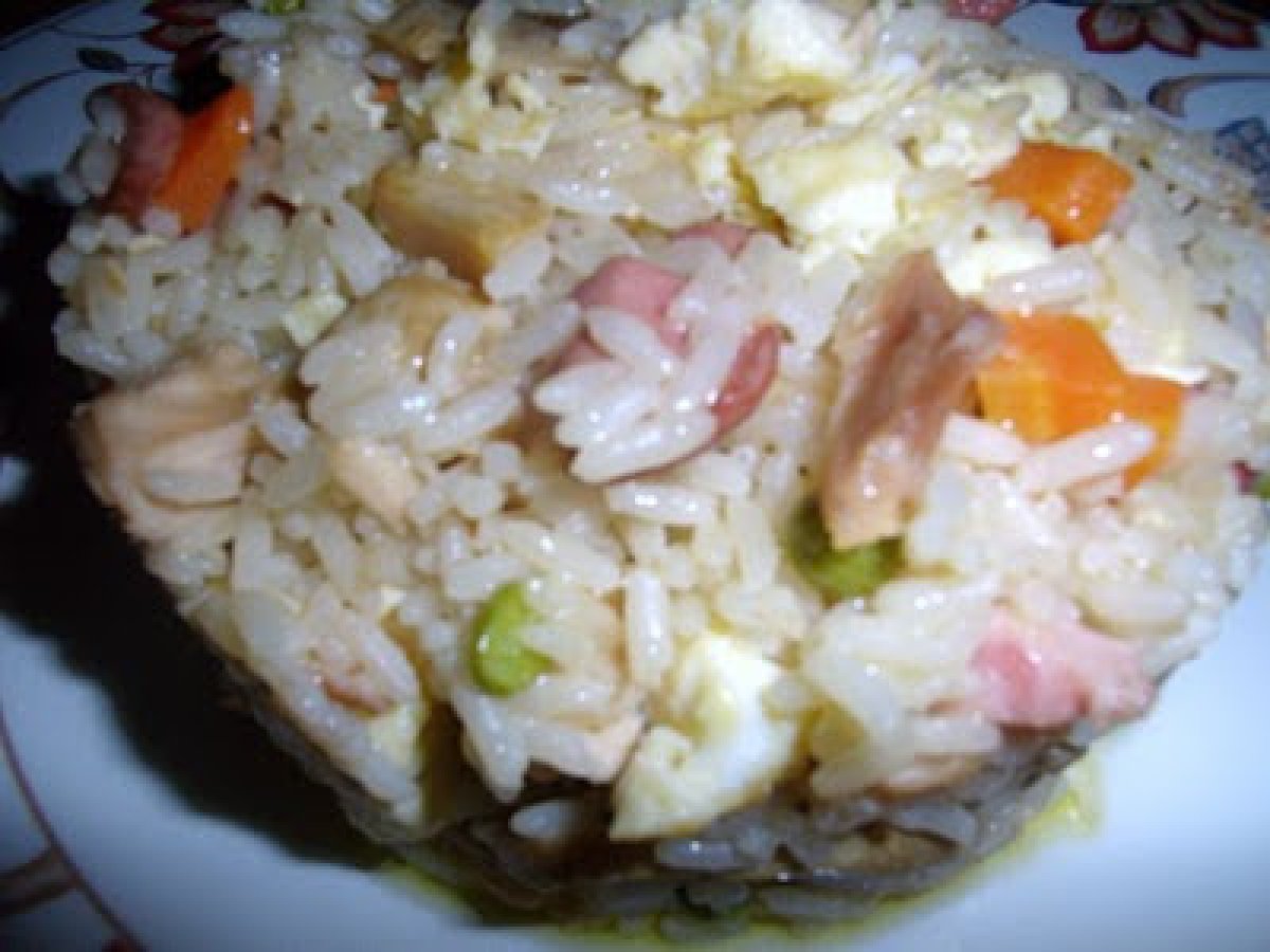 Arroz tres delicias casero. AnteriorSiguiente PlatoFácil55 min152 Kcal Enviar esta receta a un amigo Imprimir esta página Preguntar al autor Publicar la foto de esta receta Ingredientes 6 1 vaso de los de agua de arroz vapaorizado 2 huevos 1 zanahoria 1 lata de champiñones pequeña 1 cebolla 4 dientes de ajo 100 g de jamón cocido en lonchas gordas 100 g de beicón ahumado 150 g de guisantes congelados 1 pechuga de pollo asada en el horno 2 cucharadas de salsa soja sal pimienta negra molida aceite de oliva Costo estimado: 6.59Euros€ (1.1€/porción)