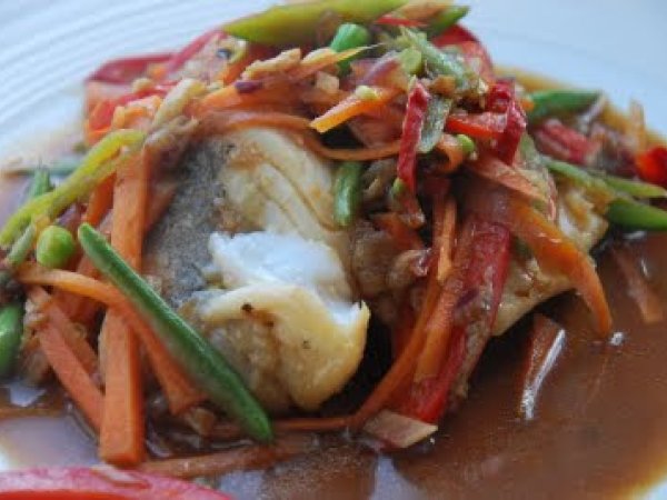 Bacalao con verduras y soja vota ahora PlatoFácil20 min Enviar esta receta a un amigo Imprimir esta página Preguntar al autor Publicar la foto de esta receta Ingredientes 1 1 diente de ajo Un poco de jengibre Lomos de pescado blanco 1 zanahoria Unos tirabeques 1/4 de pimiento rojo 4 cucharadas de salsa de soja 2 cucharadas de salsa de ostras Un vasito de caldo de pescado