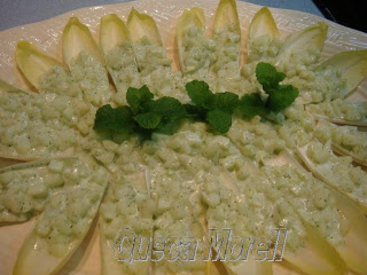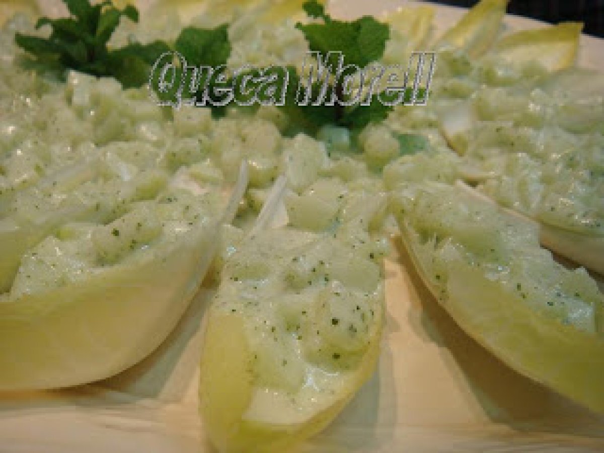 Barquillas de endivias con tzatziki. AnteriorSiguiente PlatoFácil1 hora Enviar esta receta a un amigo Imprimir esta página Preguntar al autor Publicar la foto de esta receta Optar por este plato con una decoración artística. Ingredientes 2 endivias 2 o 3 pepinos Un diente de ajo sal y pimiena blanca aceite de oliva extra virgen vinagre Hierba buena (o menta) 2 yogures naturales