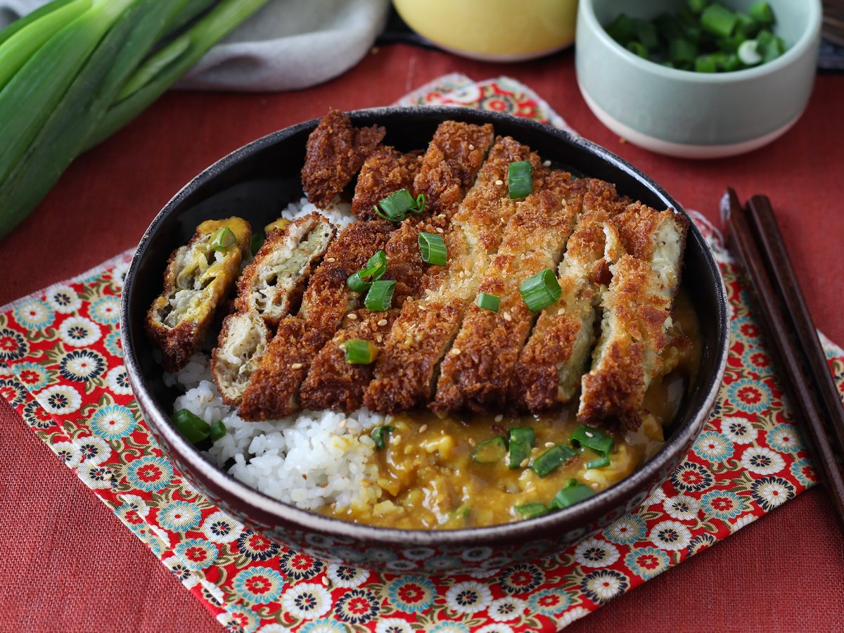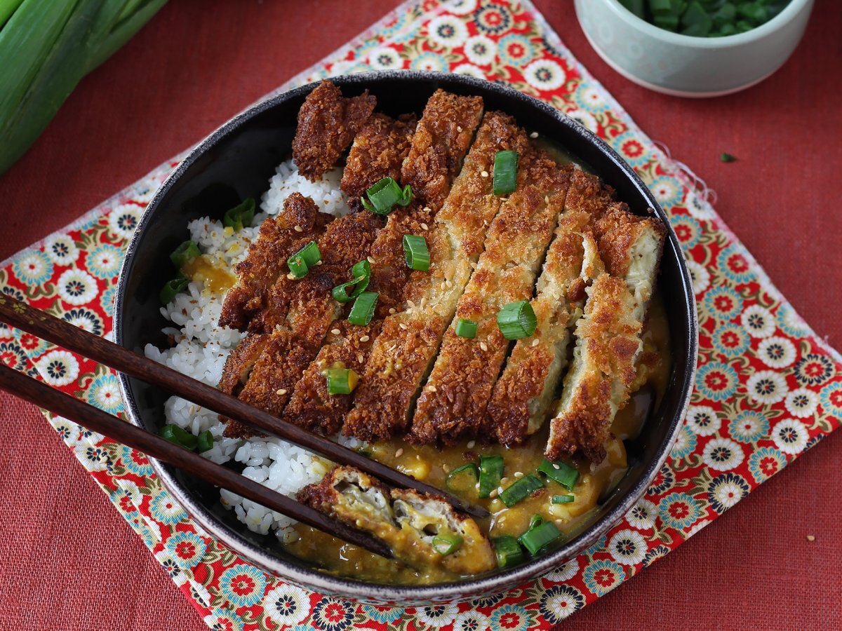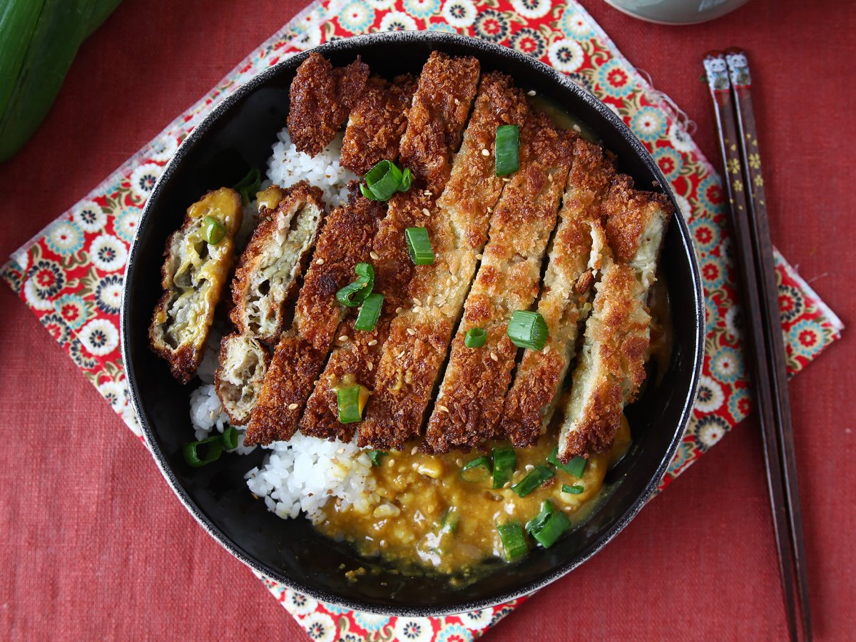 Berenjena empanada con pan rallado panko y curry japonés al estilo katsu