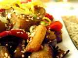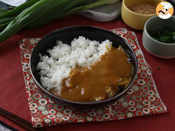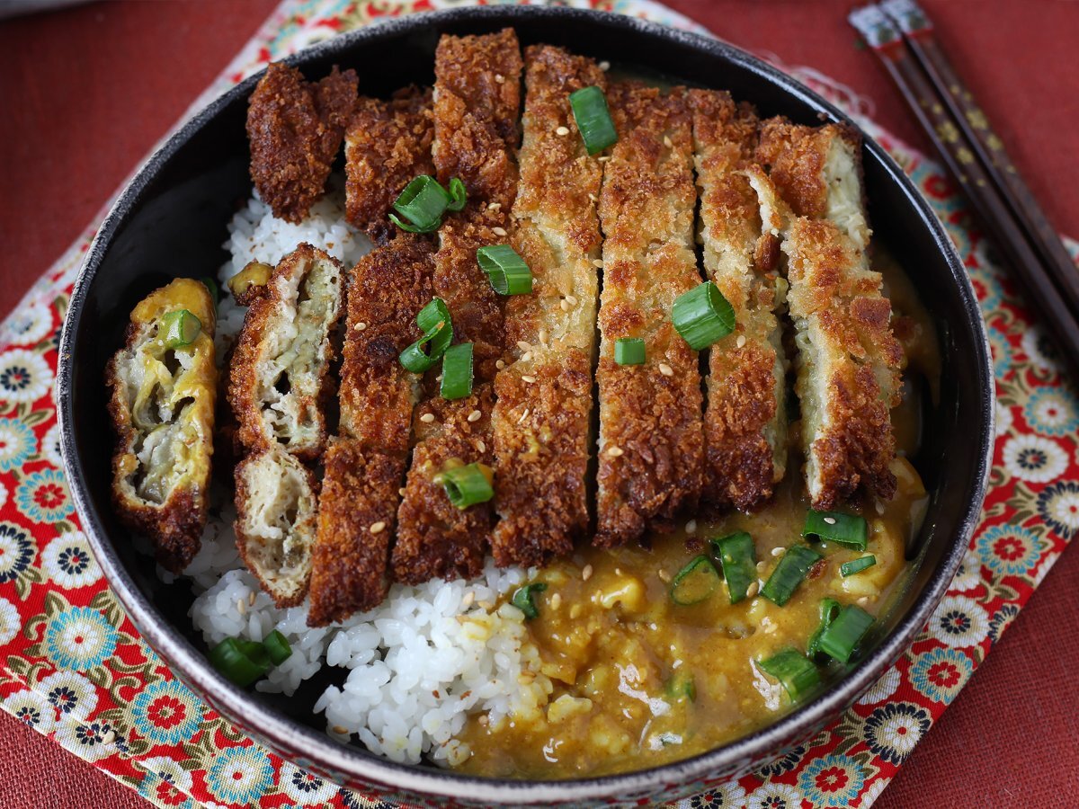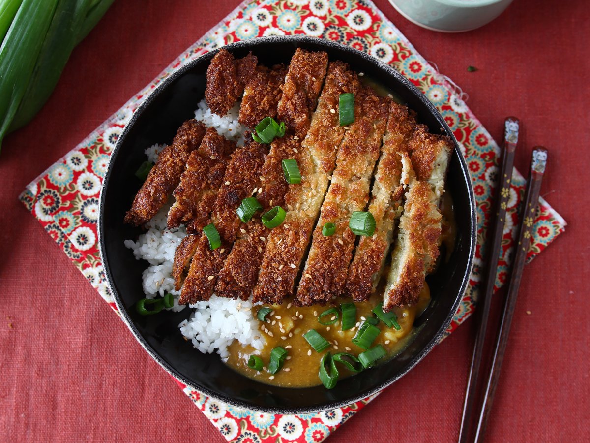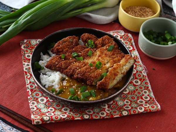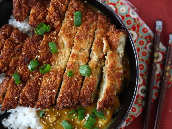 Berenjena empanada con pan rallado panko y curry japonés al estilo katsu
