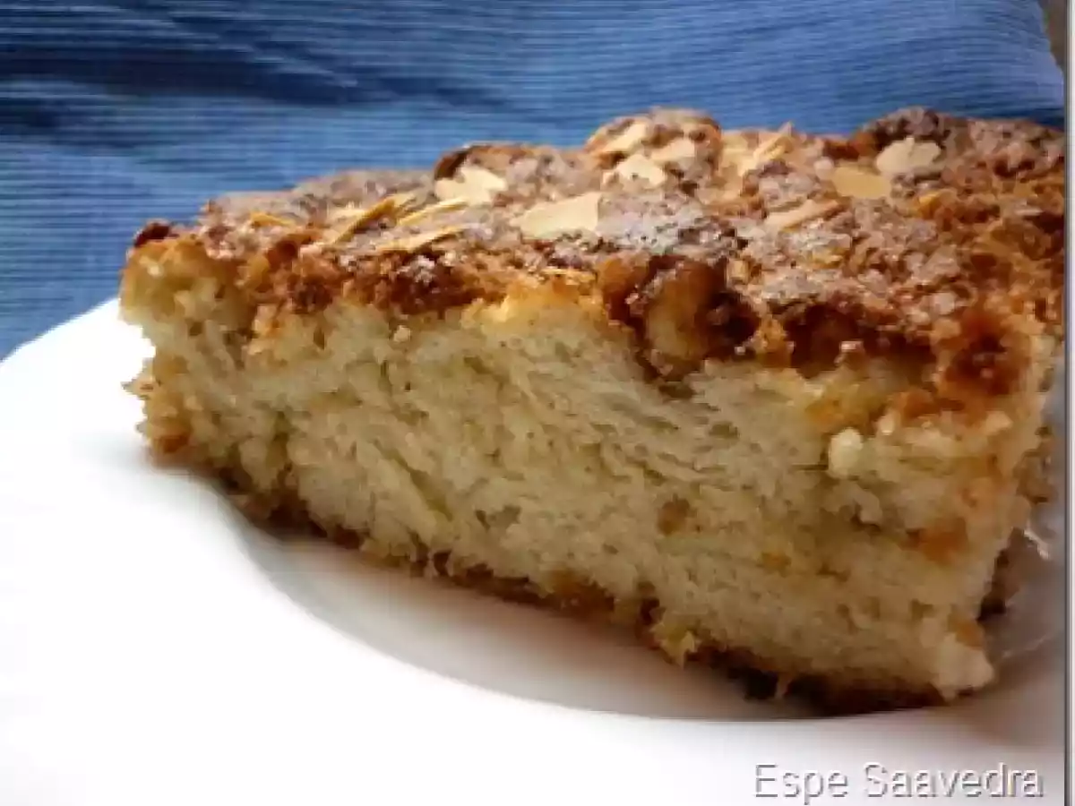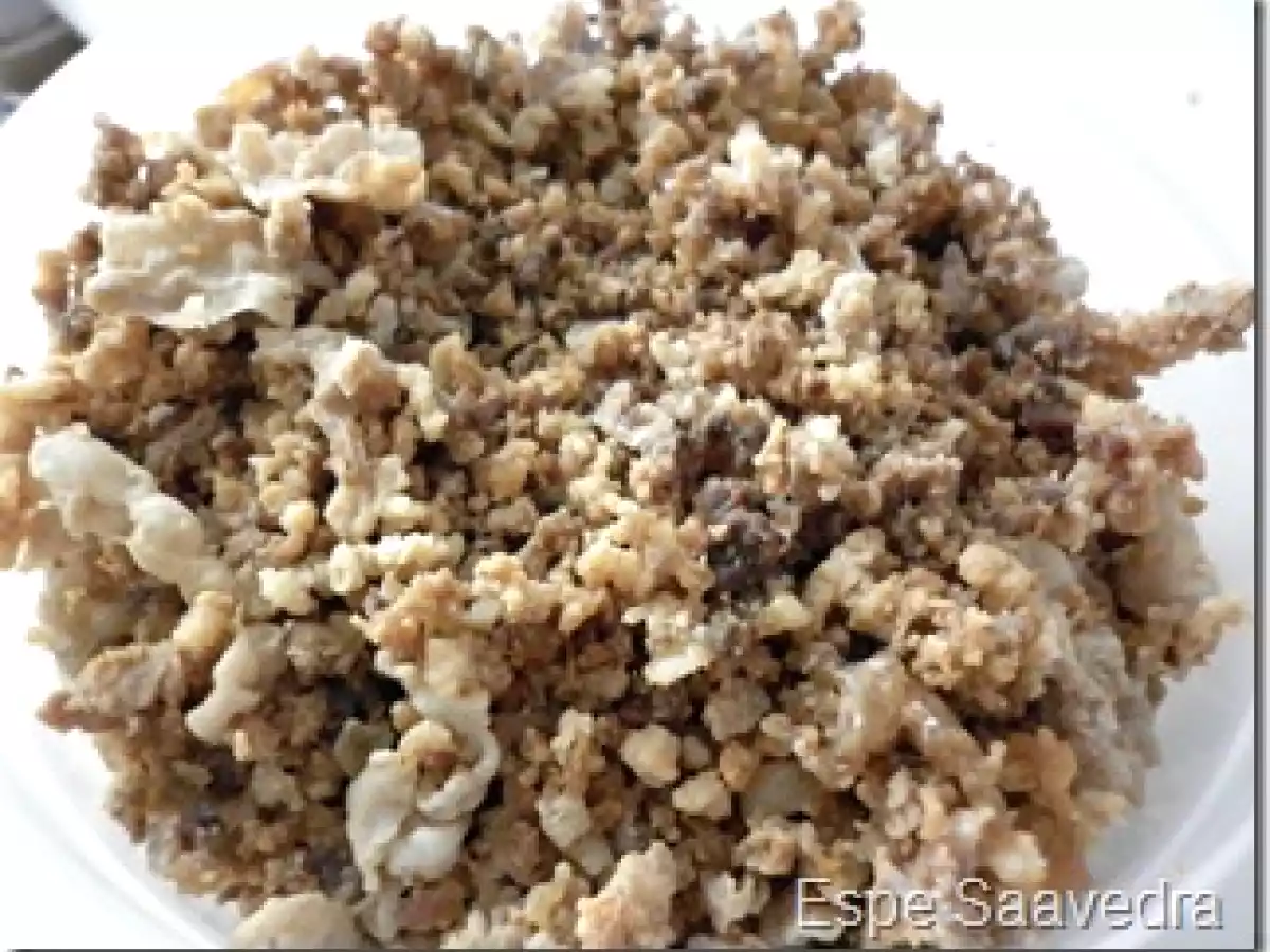 Bollo coscaron AnteriorSiguiente PlatoFácil40 min2544 Kcal Enviar esta receta a un amigo Imprimir esta página Preguntar al autor Publicar la foto de esta receta Ingredientes 2 600 g harina 325 ml agua 1/2 cucharadita de sal 40 g de levadura prensada fresca 300 g de coscaron o chicharrones 2 cucharadas de manteca 250 g de azúcar 2 huevos 100 ml de anís azúcar canela almendras laminadas y nueces