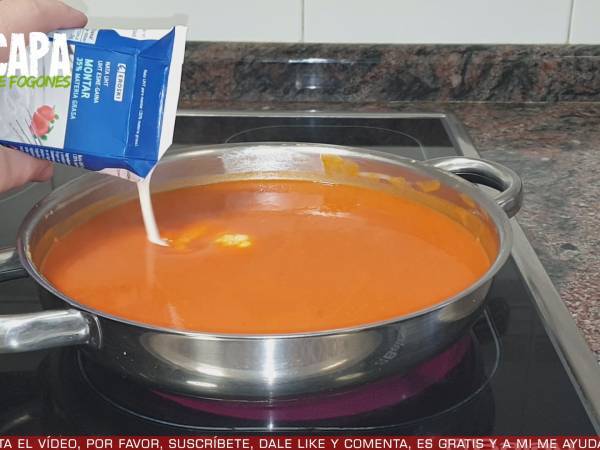 Después, añadimos el contenido de la cazuela a un vaso batidor y procedemos a triturarlo. Una vez triturada la salsa la añadimos a la misma cazuela, rebañamos bien el vaso batidor para no desperdiciar nada. Ahora añadimos un chorrito de nata liquida y mezclamos para que se integre bien la nata.