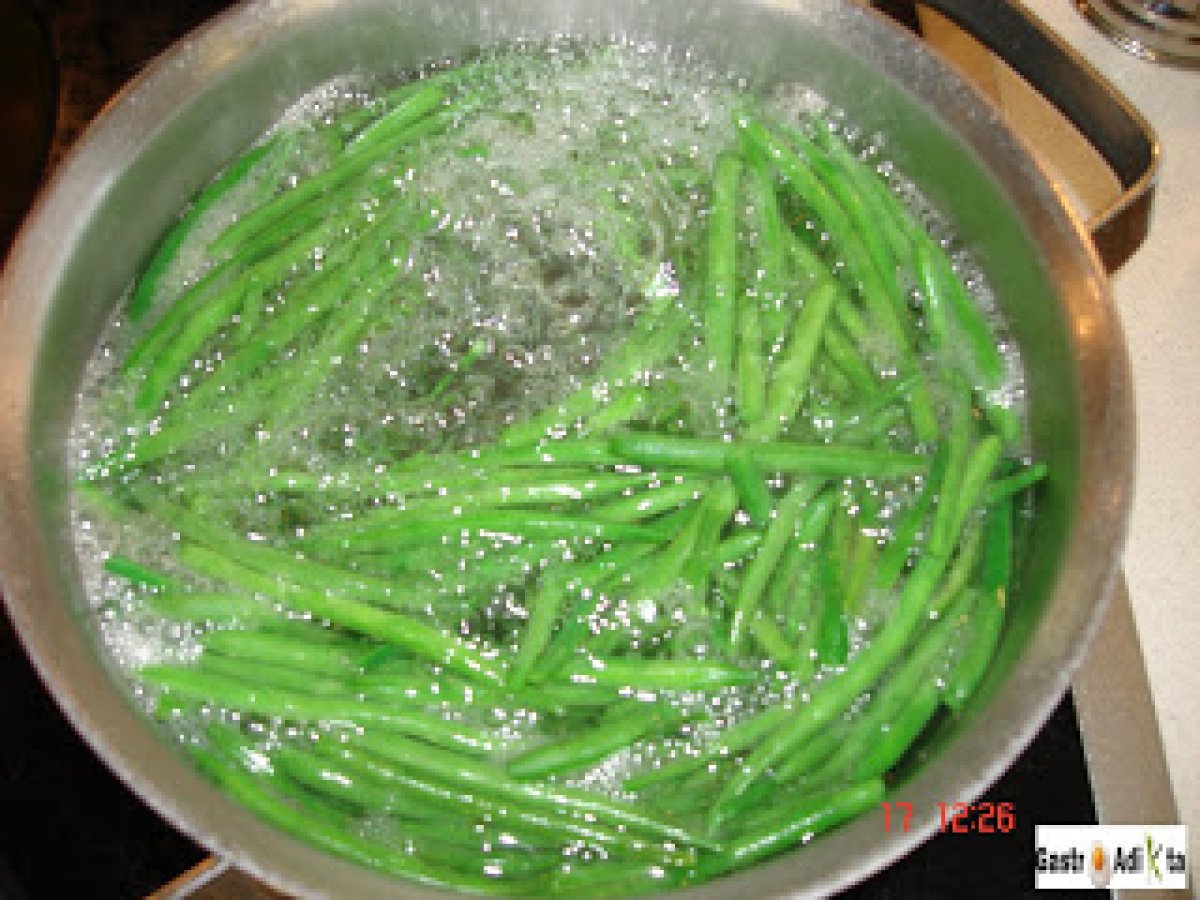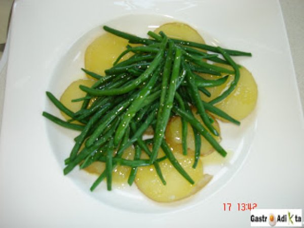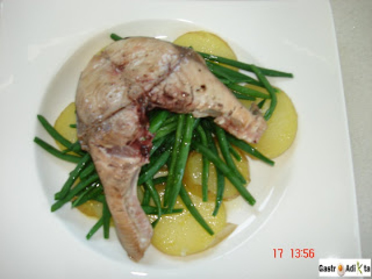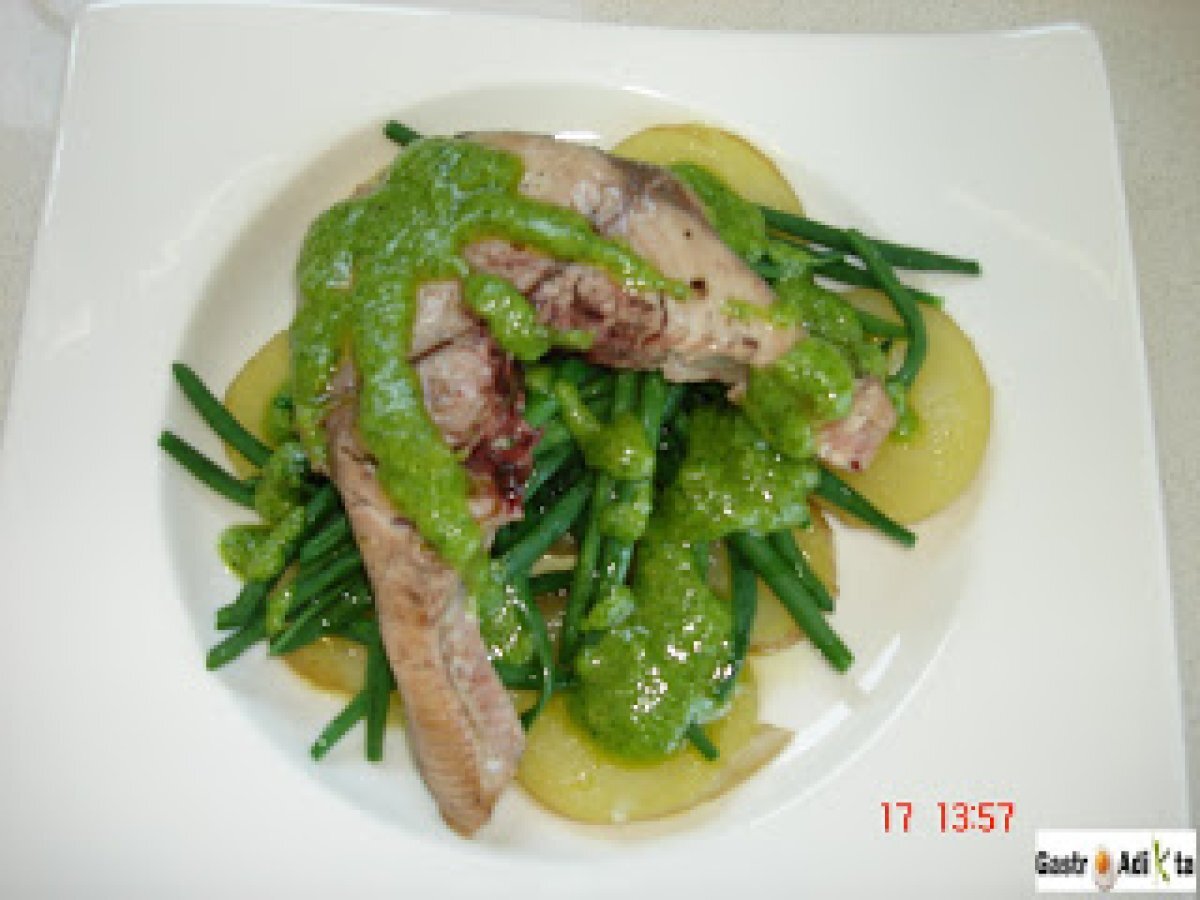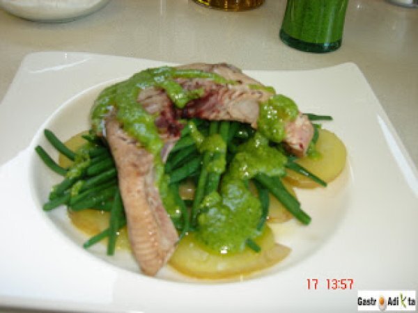 Bonito, patata y judía verde con pesto vota ahora AnteriorSiguiente PlatoFácil50 min636 Kcal Enviar esta receta a un amigo Imprimir esta página Preguntar al autor Publicar la foto de esta receta Ingredientes 4 4 rodajas de bonito, de unos 150 g cada una 4 patatas 400 g de judía perona o tipo kenya, bobby... 1 diente de ajo 50 g de piñones 20 g de hojas de albahaca 10 g de hojas de perejil 50 g de parmesano rallado 80 ml de aceite de oliva virgen extra 10 g de mantequilla Sal Pimienta Costo estimado: 13.34Euros€ (3.33€/porción)