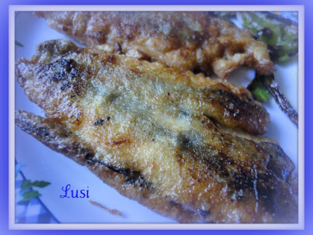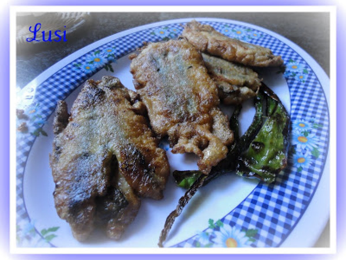 Boquerones rebozados y rellenos de pimiento verde AnteriorSiguiente PlatoFácil30 min892 Kcal Enviar esta receta a un amigo Imprimir esta página Preguntar al autor Publicar la foto de esta receta Ingredientes 2 Boquerones frescos Harina Huevo pimientos verdes Aceite de oliva y sal Costo estimado: 2.79Euros€ (1.39€/porción)