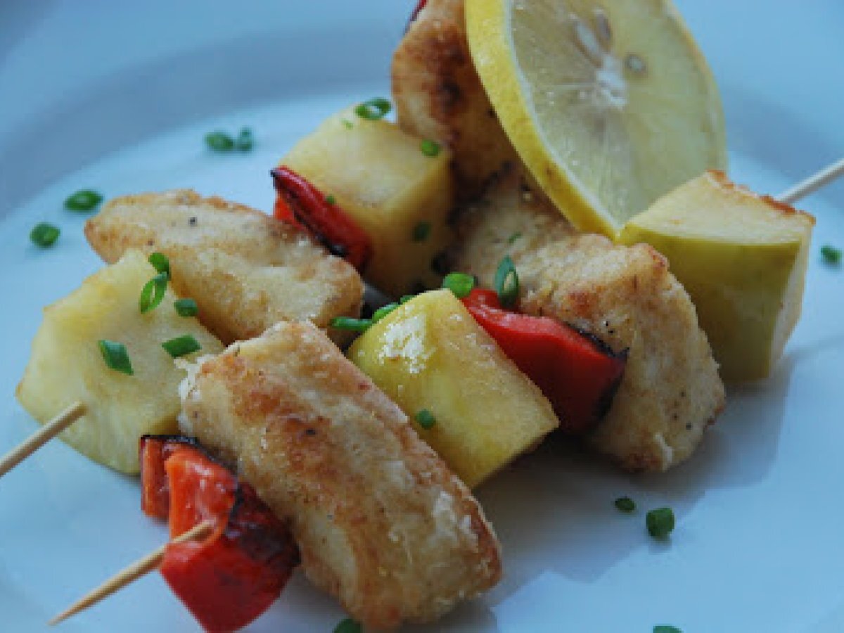 Brochetas de bacalao marinado en curry y manzana caramelizada PlatoFácil30 min Enviar esta receta a un amigo Imprimir esta página Preguntar al autor Publicar la foto de esta receta Ingredientes 2 2 lomos de bacalao fresco sin piel 1 manzana Granny Smith Medio pimiento rojo pequeño Un poco de pasta de curry amarilla Sal y pimienta Mantequilla Harina Azúcar Aceite