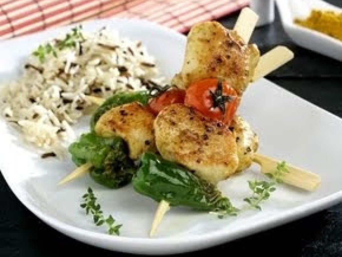 Brochetas de pollo marinadas al curry PlatoFácil35 min672 Kcal Enviar esta receta a un amigo Imprimir esta página Preguntar al autor Publicar la foto de esta receta Ingredientes 2 500 g de pechuga de pollo. 12 tomates Cherry. 12 pimientos de Padrón. 2 dientes de ajo. Aceite de Oliva Virgen. ½ limón exprimido. 1 cucharada de curry. 1 cucharadita de comino molido Pimienta. Sal. Costo estimado: 13.87Euros€ (6.94€/porción)