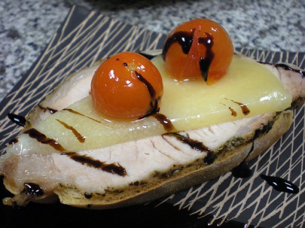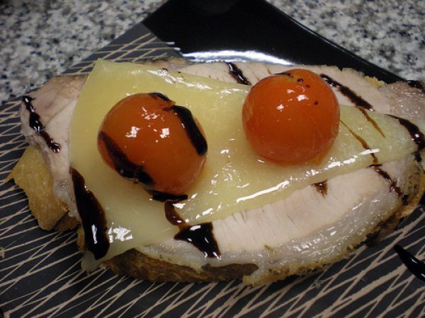 Bruschetta de lomo a la sal con queso curado y tomatitos confitados. paso a paso. AnteriorSiguiente PlatoFácil30 min721 Kcal Enviar esta receta a un amigo Imprimir esta página Preguntar al autor Publicar la foto de esta receta Ingredientes 2 Lomo a la sal 1 barra de pan 1 diente de ajo 200 g de queso curado 100 de tomates cherry 50 g de azúcar 10 ml de vino blanco Aceite de oliva virgen extra. Costo estimado: 7.6Euros€ (3.8€/porción)