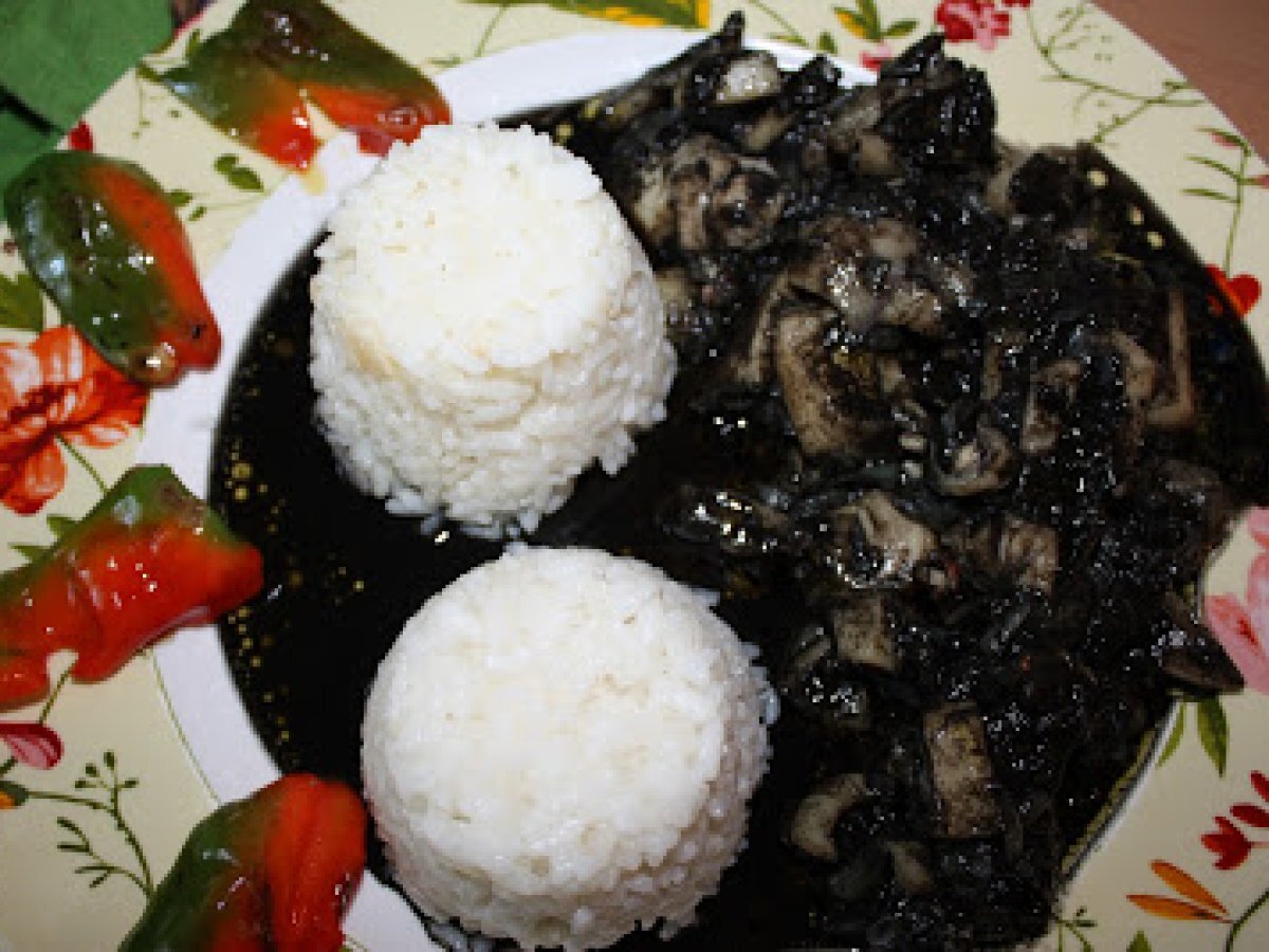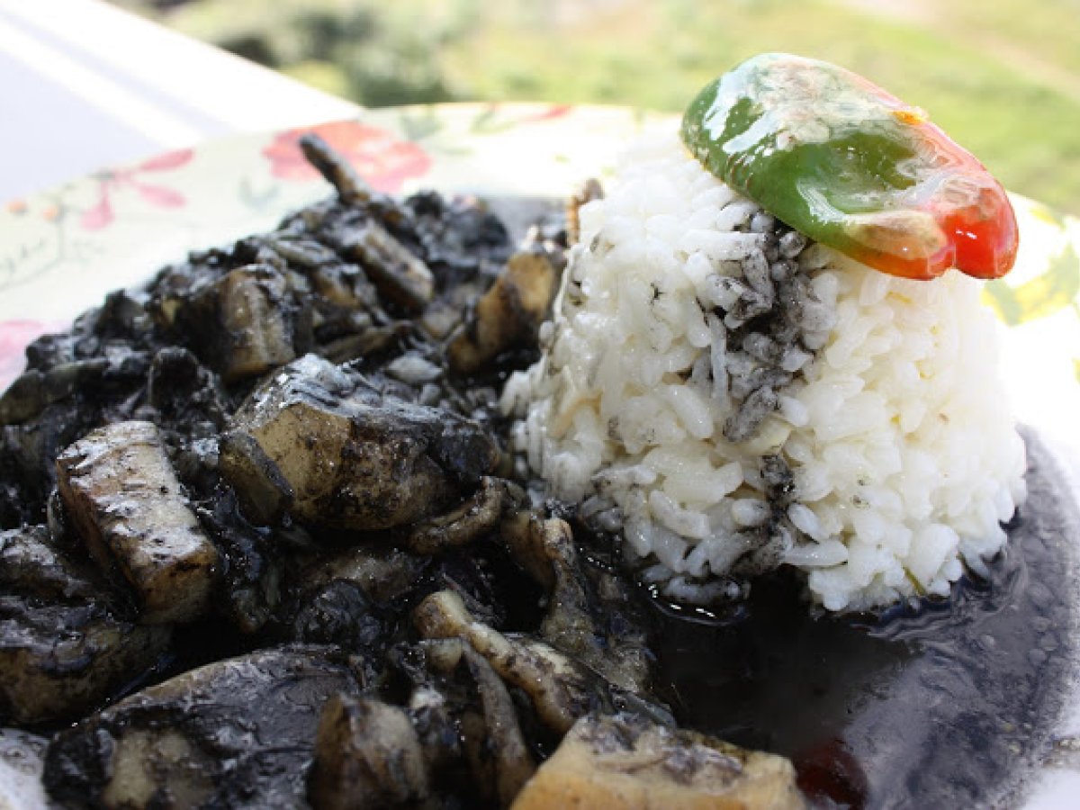 - Flanes de arroz y unos pimientos rehogados en la sartén. Rehogar la cebolla cortada en cuadrados y el ajo. Cuando esté, añadir el cachón troceado, dar unas vueltas, echarle sal, no mucha. Añadir el vino blanco, más vueltas otros 3 minutos aprox. Incorporar la tinta, marear un poco más y echar el agua.