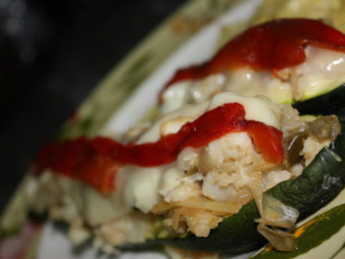 Calabacines rellenos de merluza AnteriorSiguiente PlatoFácil20 min Enviar esta receta a un amigo Imprimir esta página Preguntar al autor Publicar la foto de esta receta Ingredientes 2 1 calabacín 1 filete grande de merluza 1/2 puerro pimiento verde y rojo 1 diente de ajo 1/2 cebolla. sal, aceite Para ADORNAR: lonchas de queso manchego y pimientos asados.