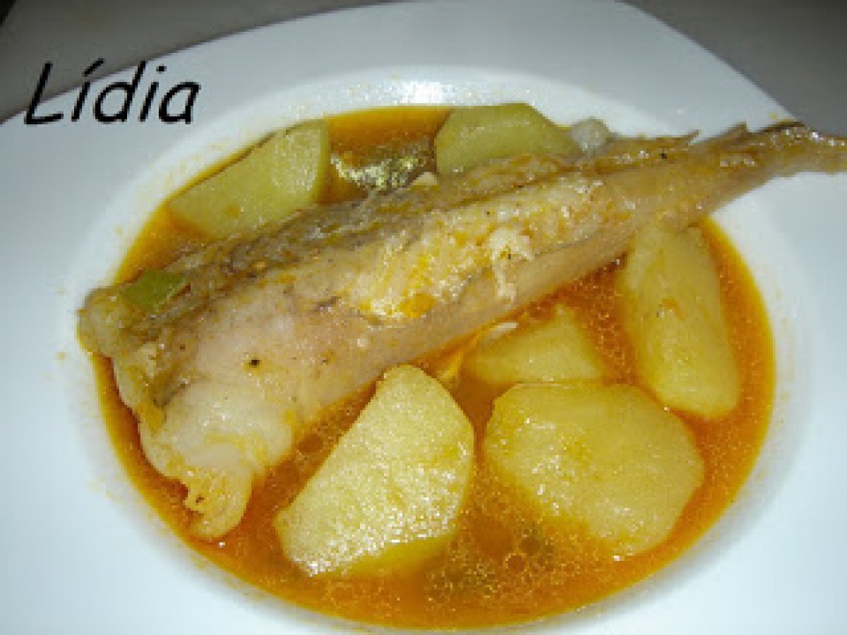 Caldeirada de rape con patatas PlatoFácil35 min Enviar esta receta a un amigo Imprimir esta página Preguntar al autor Publicar la foto de esta receta Ingredientes 4 4 colas de rape 4 patatas 1 pimiento verde 1 tomate 1 cebolla 1 diente de ajo pimentón aceite sal y pimienta media cabeza de rape 1 cebolla 1 hoja de laurel sal