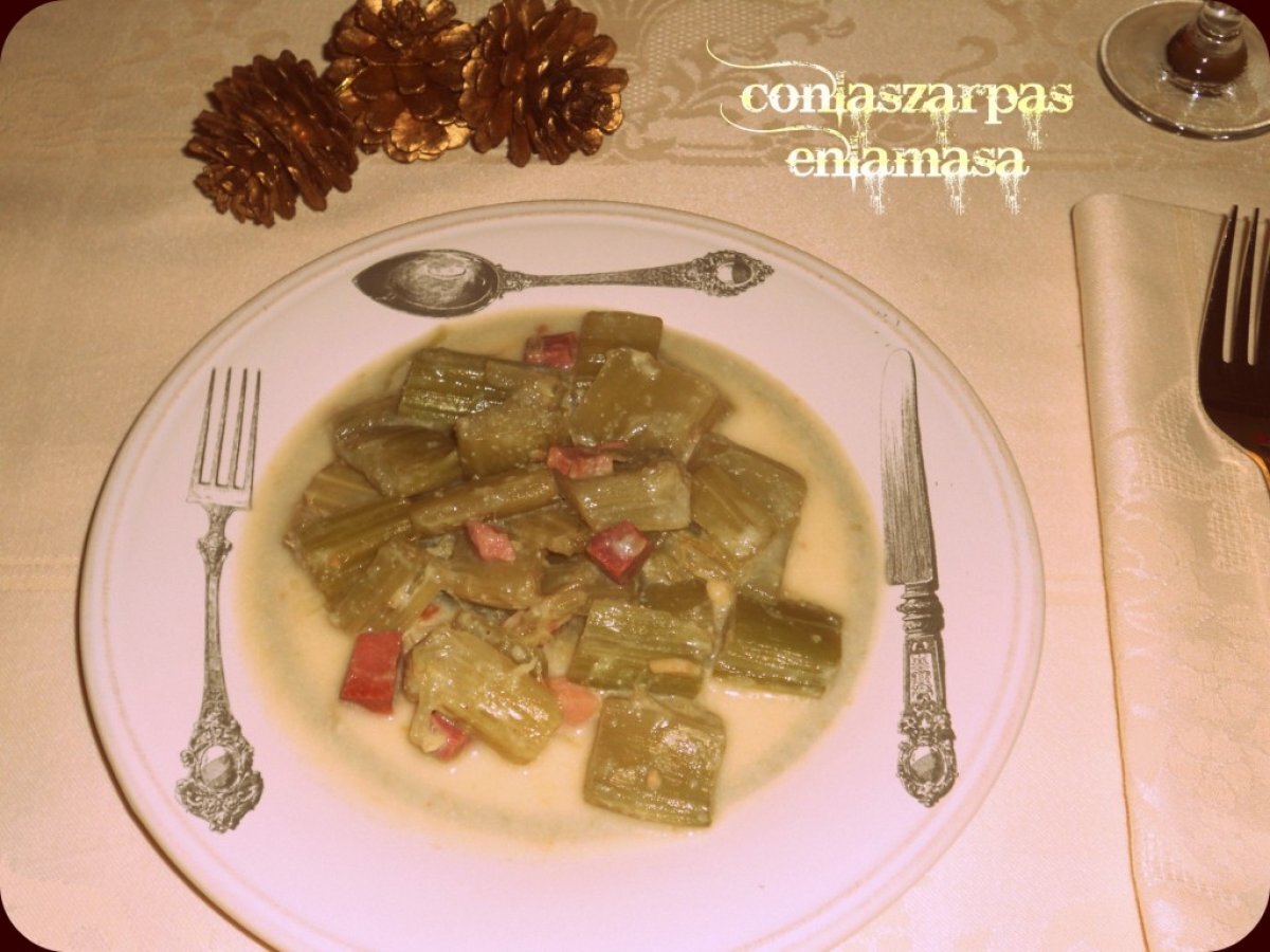 - Limpiamos el cardo por lo lados y limpiamos ( como si fuera acelga). Colocamos en la olla con agua y hervimos durante 10 minutos. Desechamos ese agua y volvemos a colocar el cardo en la olla con agua, sal y una pastilla de caldo de carne si es nuestro gusto. Hervimos hasta que el cardo esté hecho (en la olla express, unos 10 minutos).
