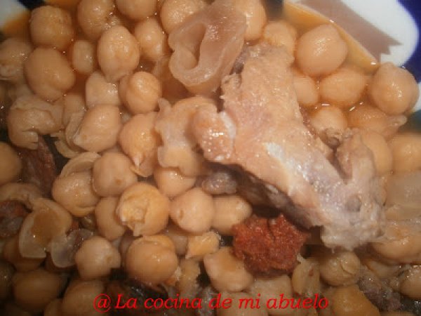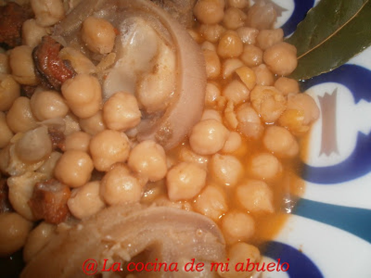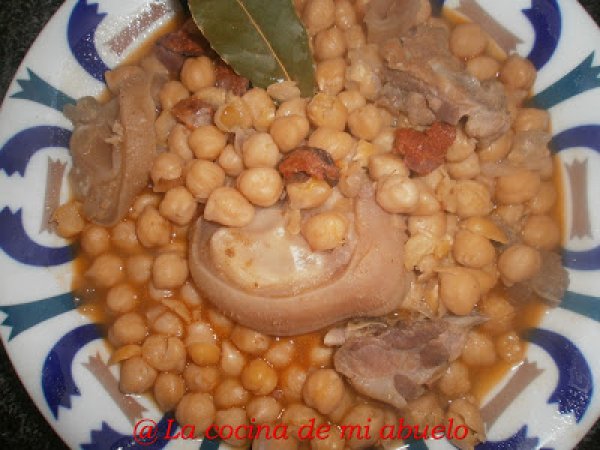 - Echamos los garbanzos castellanos, la hoja de laurel y cubrimos con agua, dejamos cocinar a fuego lento hasta que los garbanzos esten blandos. A media cocción echamos sal y el chorizo picado en rodajas.