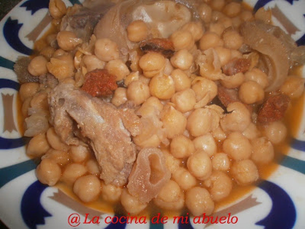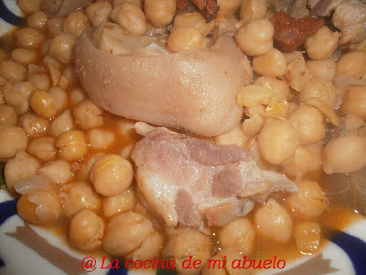 - La noche anterior ponemos los garbanzos a remojo. Ponemos en una cazuela un poco de aceite y echamos la panceta troceada, las patas de gallina troceadas, las patas de ternera, los huesos de cerdo salado y el hueso de jamón, doramos bien.