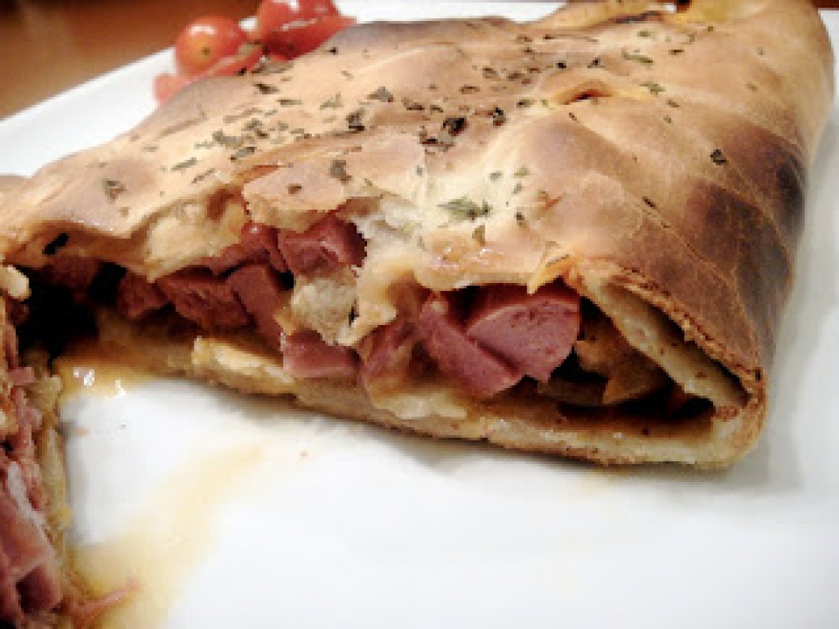 Calzone de frankfurt, cebolla frita y aceite de orégano AnteriorSiguiente PlatoFácil1 h 10 m Enviar esta receta a un amigo Imprimir esta página Preguntar al autor Publicar la foto de esta receta Ingredientes 4 1 masa de pizza 2 salchichas de frankfurt 2 cebollas 2 lonchas de bacon 3 cdas de tomate frito casero 2 lonchas de queso tomatitos cherrys aceite guindilla ajos y orégano
