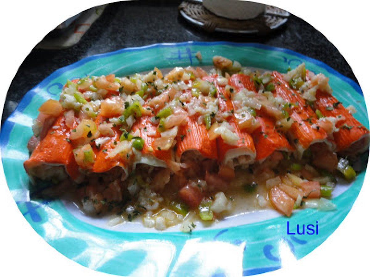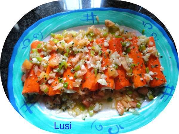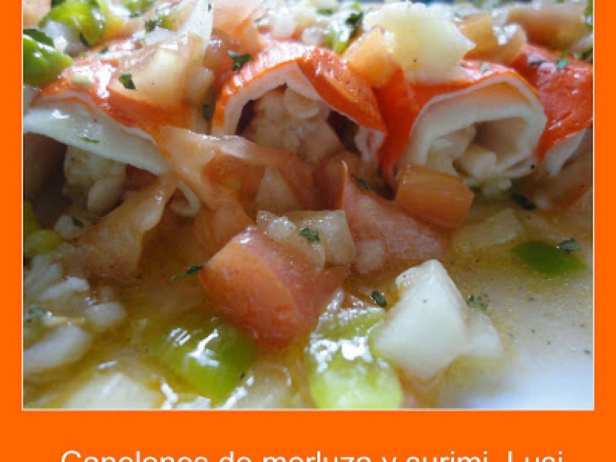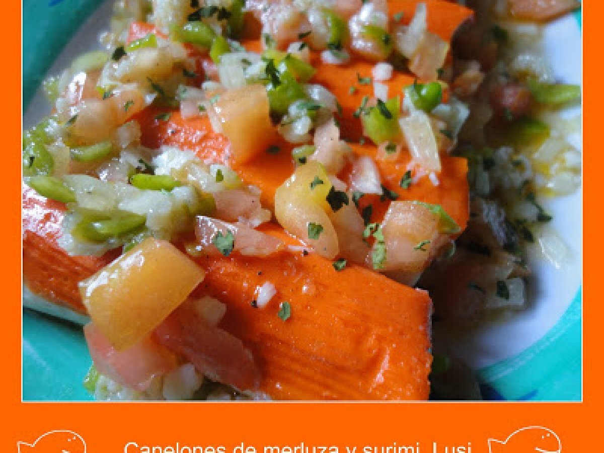 Canelones de merluza y surimi AnteriorSiguiente PlatoFácil25 min156 Kcal Enviar esta receta a un amigo Imprimir esta página Preguntar al autor Publicar la foto de esta receta Ingredientes 4 8 barritas de surimi 100g de merluza en filete ó Panga 1 tomate 1 cebolleta 1 pimiento verde 1/2 pimiento rojo Aceite de oliva virgen extra Vinagre de Jerez Sal y pimienta Perejil picado