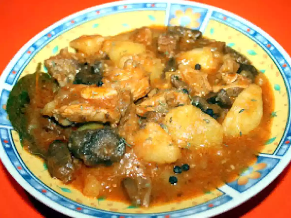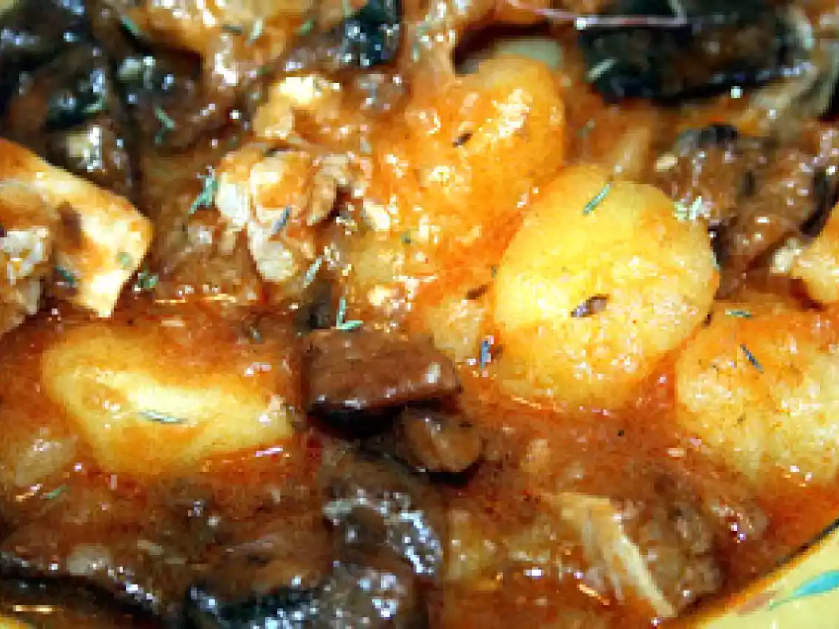 Carne de ternera con niscalos y patatas AnteriorSiguiente PlatoMedio1 h 5 m Enviar esta receta a un amigo Imprimir esta página Preguntar al autor Publicar la foto de esta receta Ingredientes 4 350 g de churrasco de ternera a trozos una cebolla mediana 3 dientes de ajo tomillo pimienta en grano 200 g de niscalos en trozos 2 hojas de laurel 3 patatas medianas a cascos agua para cubrir sal 1 cuchara de pimenton 1 vasito de vino 70 cc de aceite de oliva Costo estimado: 18.37Euros€ (4.59€/porción)