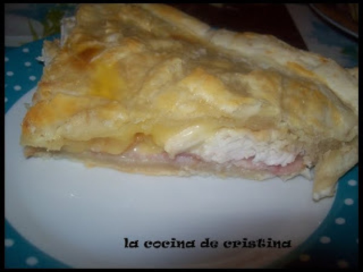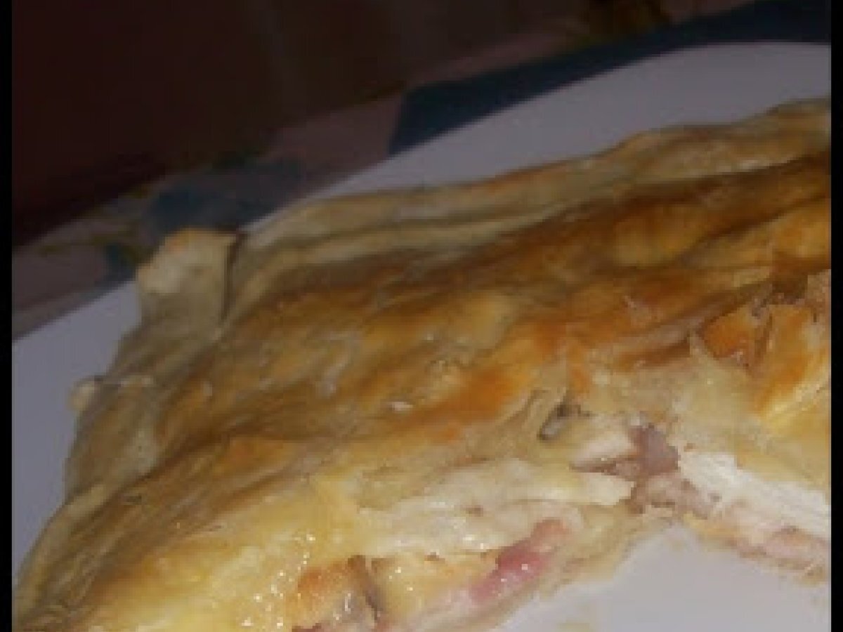 - Se rellena el hojaldre con tiras de beicon hasta cubrir el pollo por encima y el queso en lonchas