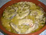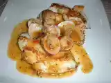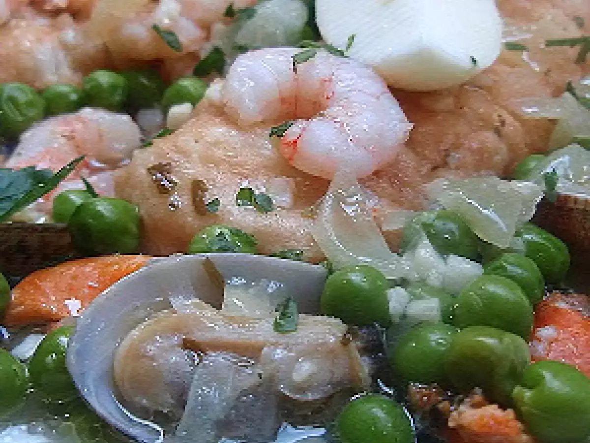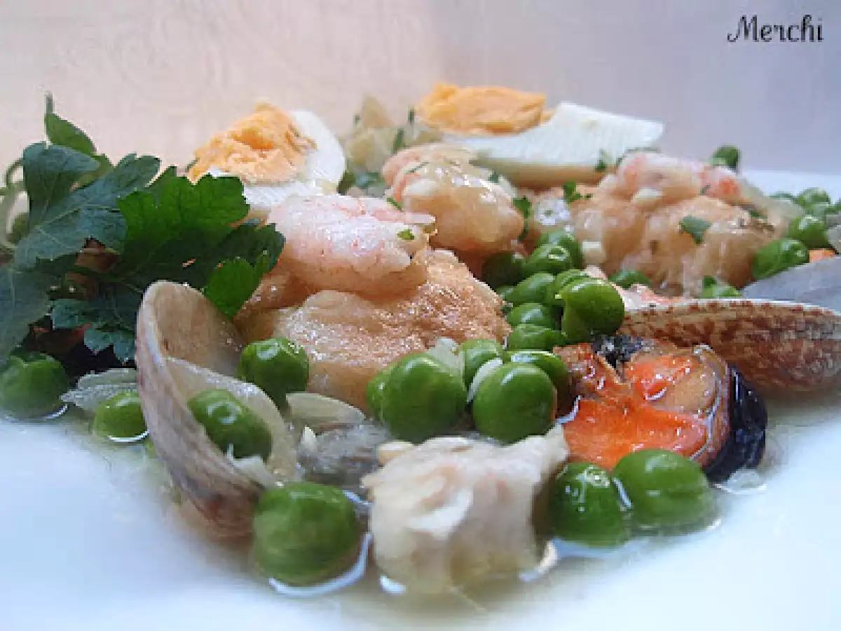 Cazuela de merluza a la marinera AnteriorSiguiente PlatoFácil1 hora1834 Kcal Enviar esta receta a un amigo Imprimir esta página Preguntar al autor Publicar la foto de esta receta Ingredientes 1 1 merluza 350 g de almejas 400 g de gambas Una docena mejillones frescos 1 bote de guisantes 1 cebolla 2 huevos cocidos 1 diente de ajo perejil pimienta blanca 1 hoja de laurel 1/2 vaso de vino blanco Harina Aceite de oliva sal
