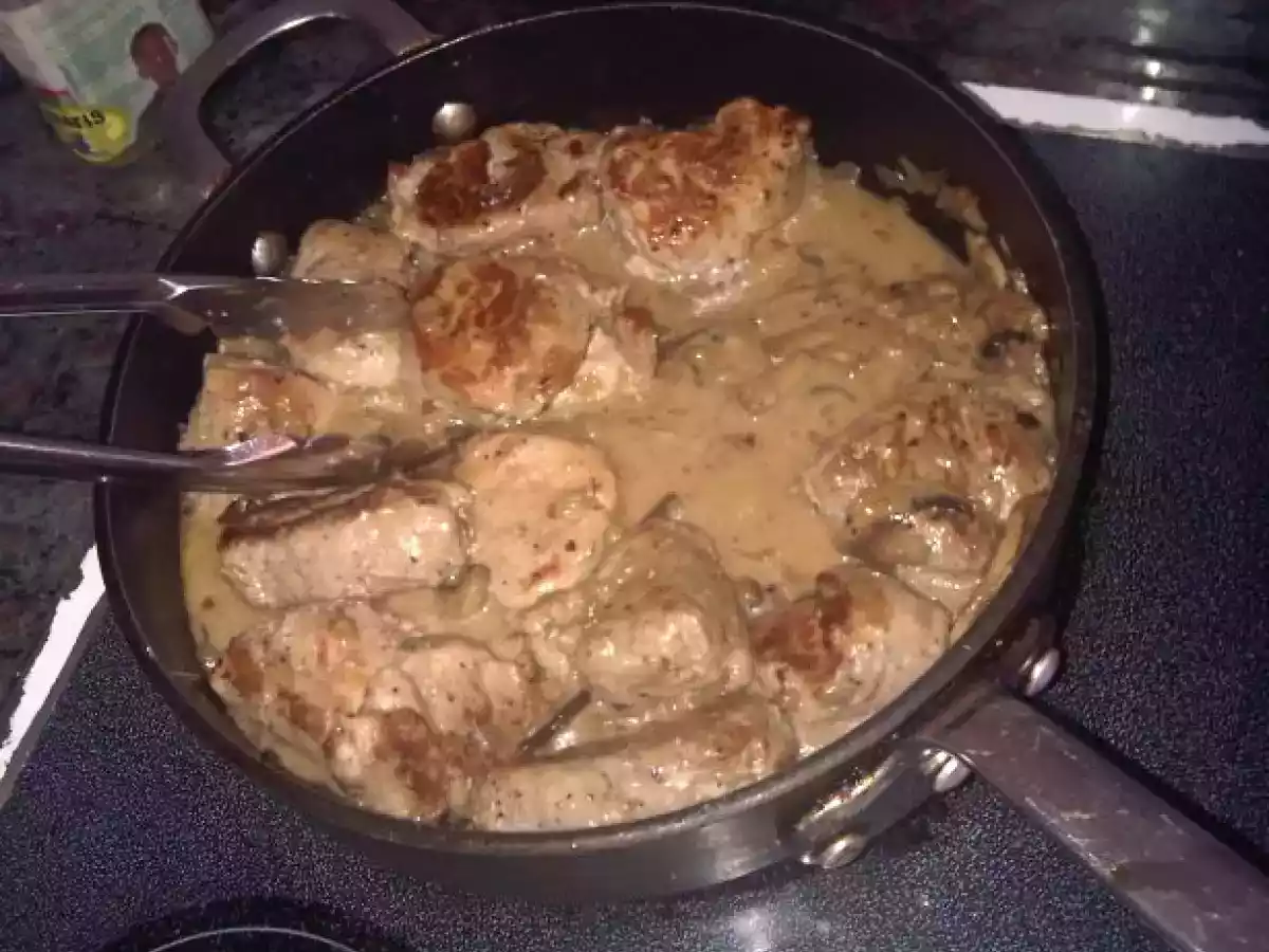 Cerdo en salsa de hongos y marsala PlatoMedio50 min782 Kcal Enviar esta receta a un amigo Imprimir esta página Preguntar al autor Publicar la foto de esta receta Ingredientes 4 2 lbs de lomo de cerdo, en medallones 2 cucharadas de aceite de oliva 2 cucharadas de mantequilla 1 cebolla mediana, en trocitos 12 oz de hongos frescos, lonjeados 2 cucharadas de harina ½ taza de Marsala 1 ½ taza de caldo de pollo 4 cucharadas de crema de leche ¼ taza perejil, picadito Costo estimado: 9.1Euros€ (2.27€/porción)