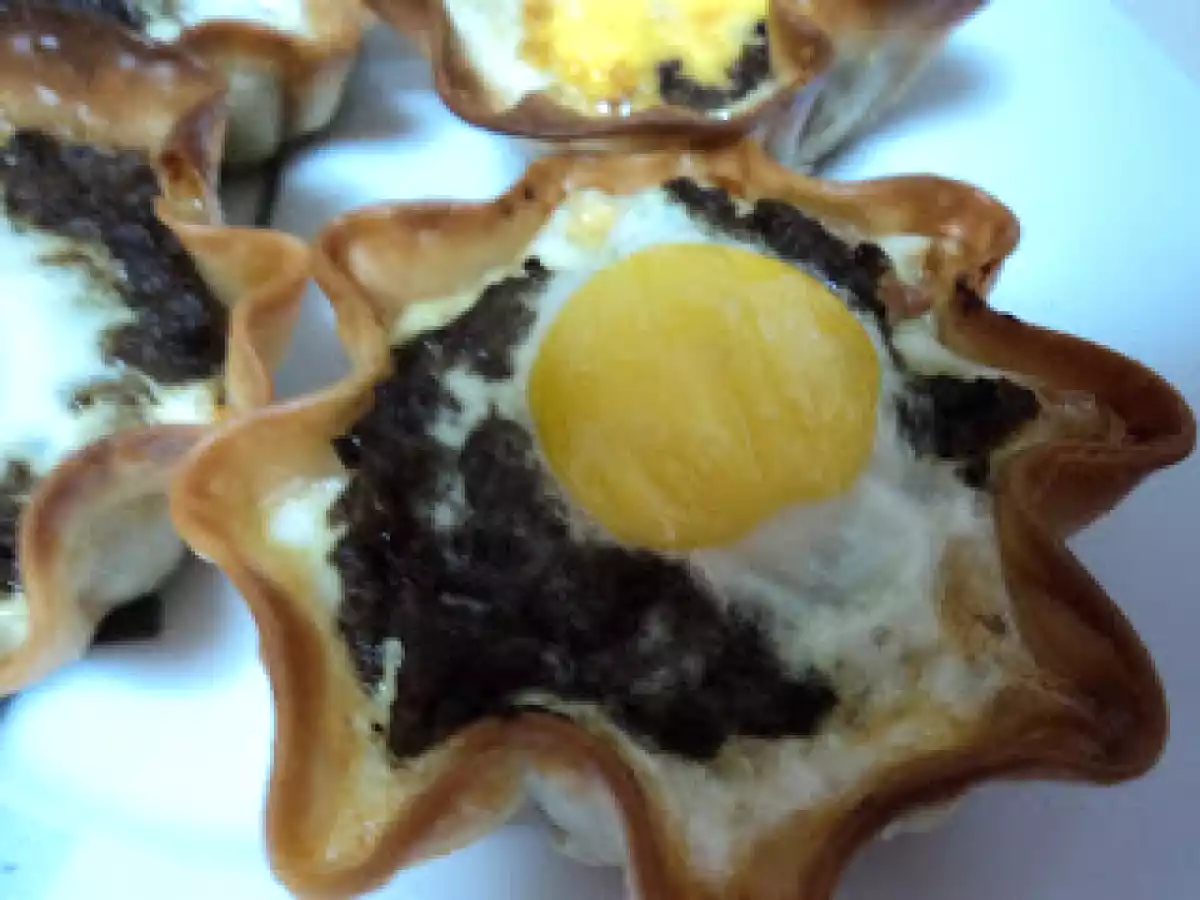Cestas de morcilla con huevo de codorniz AnteriorSiguiente PlatoFácil20 min119 Kcal Enviar esta receta a un amigo Imprimir esta página Preguntar al autor Publicar la foto de esta receta Ingredientes 2 Morcilla con piñones Masa de empanadillas Huevos de codorniz Costo estimado: 2.27Euros€ (1.14€/porción)