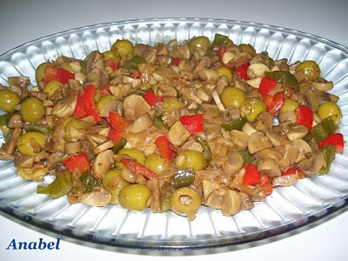Champiñones a la española PlatoFácil30 min Enviar esta receta a un amigo Imprimir esta página Preguntar al autor Publicar la foto de esta receta Ingredientes 1 1 bandeja de champiñones 1 cebolla 3 dientes de ajo 1/2 pimiento rojo 1 pimiento verde italiano 1 lata de aceitunas rellenas de anchoas Costo estimado: 2.01Euros€ (2.01€/porción)