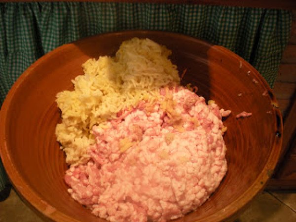 - Picamos la panceta y la carne, las patatas, los ajos y en un bol de barro u otro recipiente grande lo ponemos, le ponemos todos los aliños y lo amasamos bien.