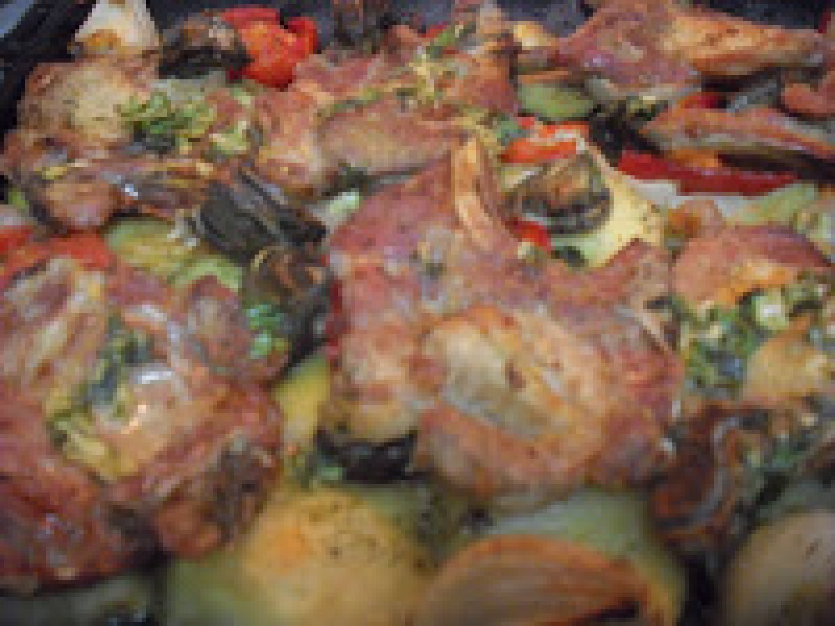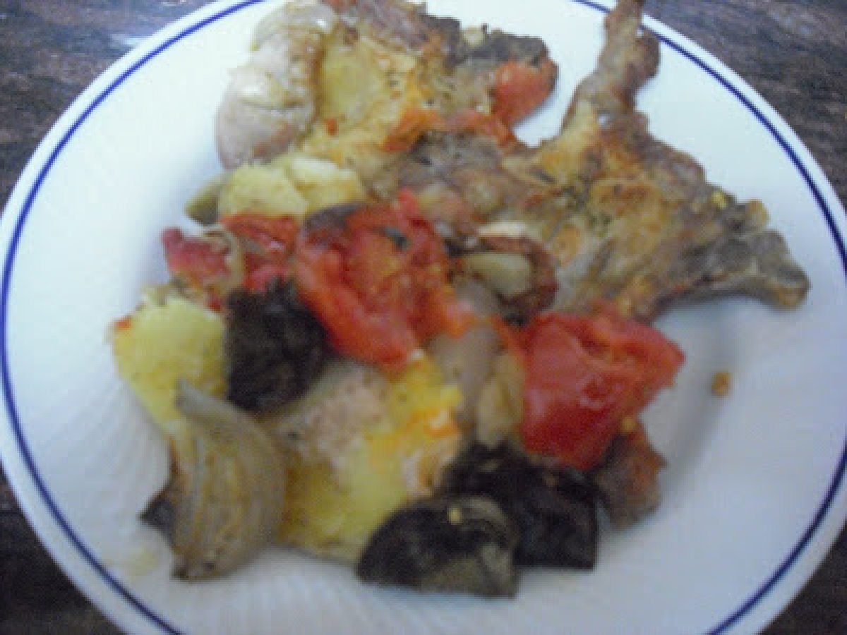 Chuletas de cerdo al horno AnteriorSiguiente PlatoFácil55 min429 Kcal Enviar esta receta a un amigo Imprimir esta página Preguntar al autor Publicar la foto de esta receta Ingredientes 6 6 chuletas de cerdo 2 patatas medianas 1 pimiento rojo 1/2 pimiento verde 2 cebollas grandes 2 tomates maduros 4 alcachofas 1 cabeza de ajos aceite sal limón y perejil