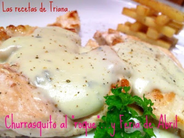 Churrasquitos de pollo al "roque" y "feria de abril" AnteriorSiguiente PlatoFácil30 min121448 Kcal Enviar esta receta a un amigo Imprimir esta página Preguntar al autor Publicar la foto de esta receta Ingredientes 2 4 Churrasquitos de pollo. 100 g de roquefort. 200 cc de nata para cocinar. 30 g de mantequilla. Brandy. Sal. Aceite de oliva. Pimienta negra.