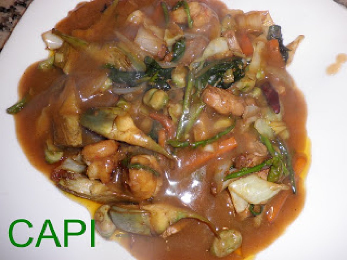 Cigalas y solomillo salteados con verduras al wok. AnteriorSiguiente PlatoFácil30 min Enviar esta receta a un amigo Imprimir esta página Preguntar al autor Publicar la foto de esta receta Ingredientes 2 solomillo de cerdo a tacos. acelgas, habas, alcachofas, zanahoria, ajos tiernos, col. guindilla, pimentón rojo dulce, sal,p.n. caldo blanco.