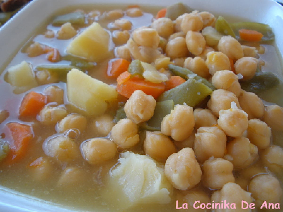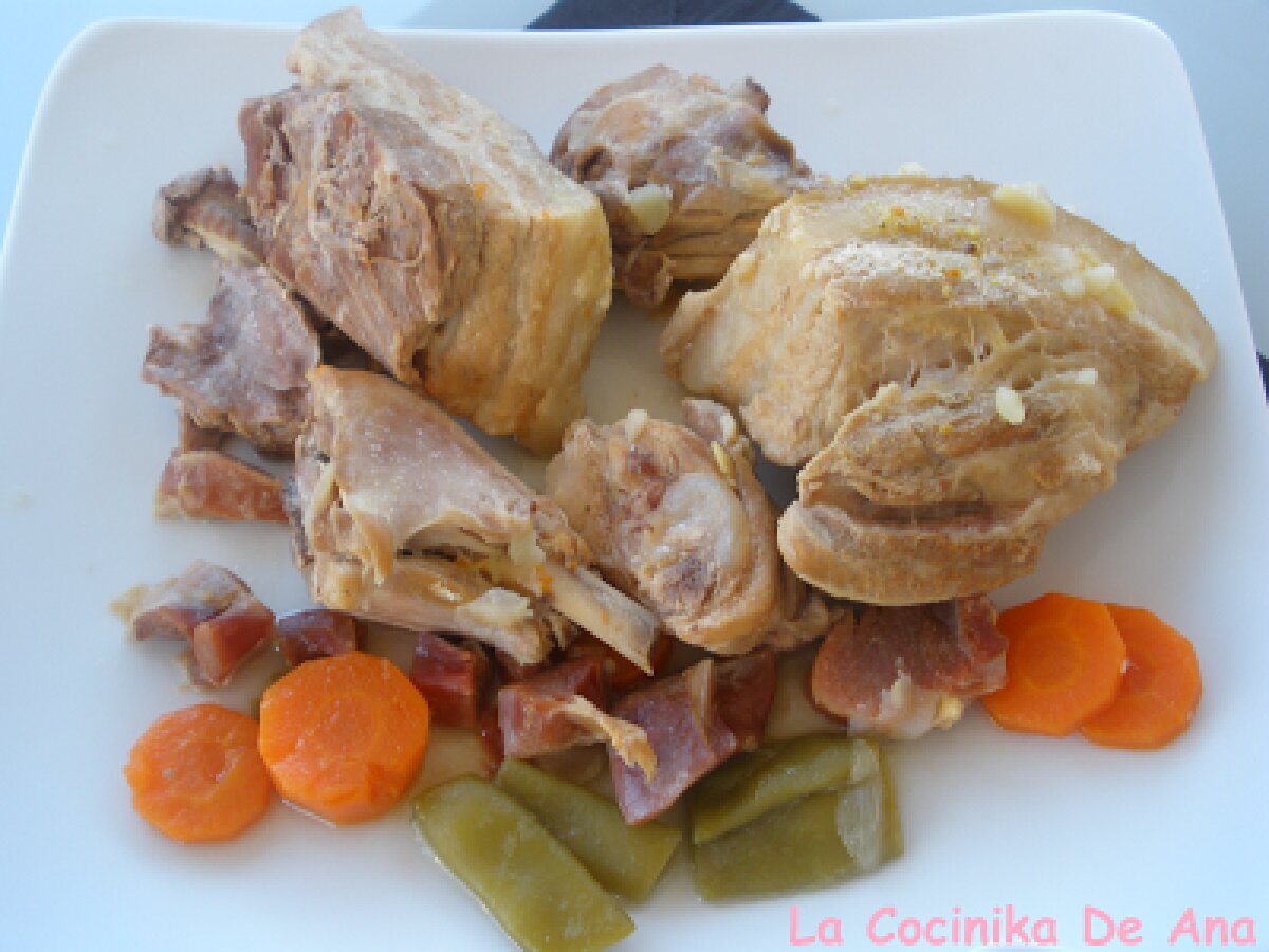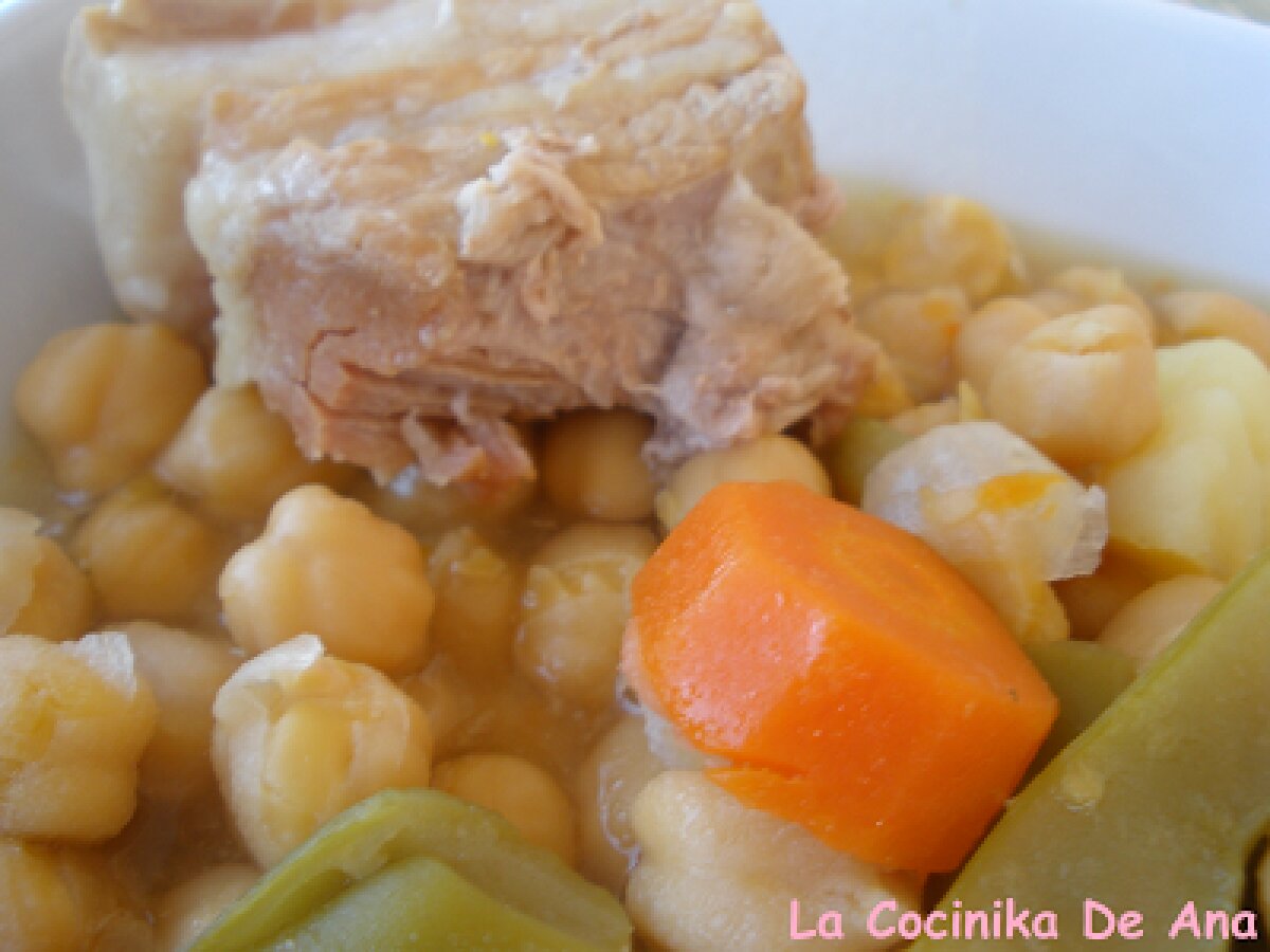 Cocido de garbanzos AnteriorSiguiente PlatoFácil1 hora Enviar esta receta a un amigo Imprimir esta página Preguntar al autor Publicar la foto de esta receta Ingredientes 4 Garbanzos Tocino de beta y otro salado Carne de ternera un trozo de guisar de unos 250 g Muslo y contramuslo de pollo. Hueso para el cocido y de canilla Zanahoria Judías planas un puñado 1 Patata grande Sal