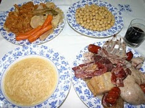 - En una olla grande ponemos agua fría abundante con la carne, los huesos de caña, el codillo y el tocino. Se pone a calentar, cuando empieza a hervir se meten los garbanzos escurridos de su agua.