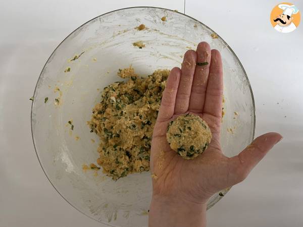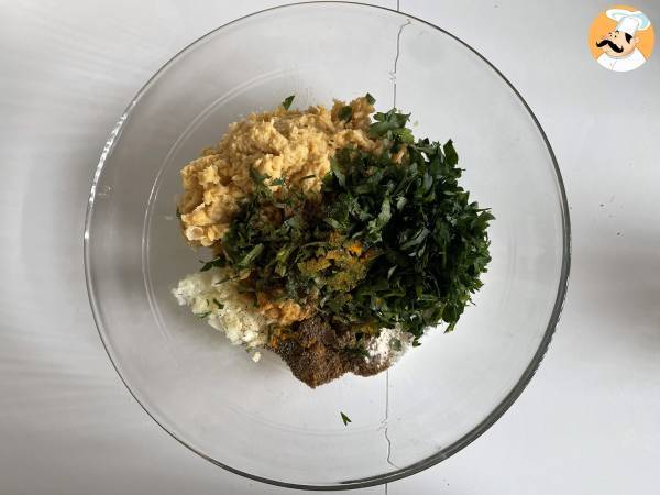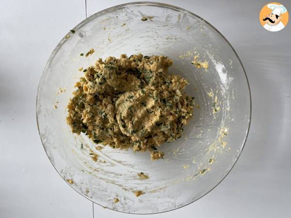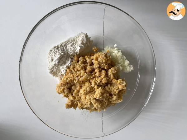 Mezclar los garbanzos triturados, la cebolla picada y el ajo en un bol con la harina.