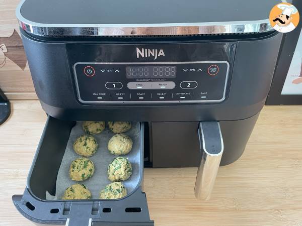 Cocer los falafels en la Airfryer durante 20 minutos a 190° sobre papel sulfurizado ligeramente engrasado, dándoles la vuelta a mitad de cocción.