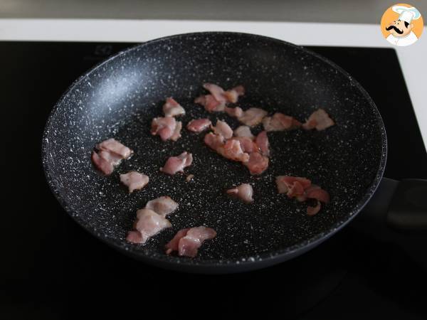 Corta el bacon en trozos. Cocínalo en una sartén a fuego medio hasta que se dore.