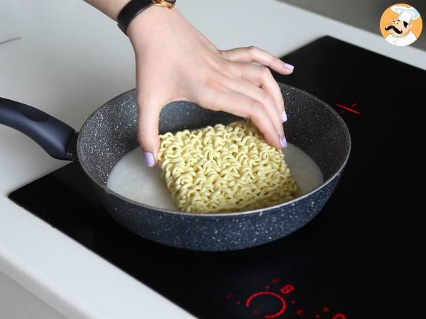 Abre la bolsa de ramen y coloca los fideos en la sartén.