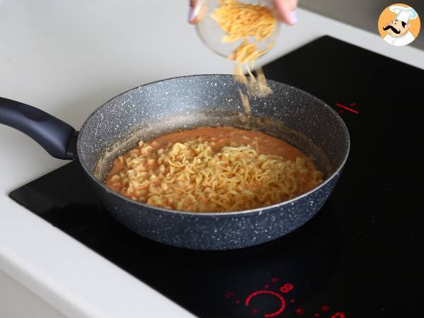 Puedes utilizar los ingredientes indicados anteriormente, pero también añadir un huevo pasado por agua, tteok (ñoquis coreanos de arroz) e incluso más queso. Aquí hemos utilizado mozzarella y queso cheddar.