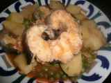 - Se deja cocer como 1/4 de hora y se incorpora el pescado salado previamente. Se cuece todo media hora a fuego lento.